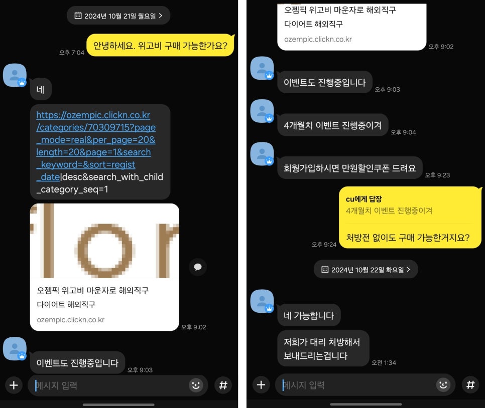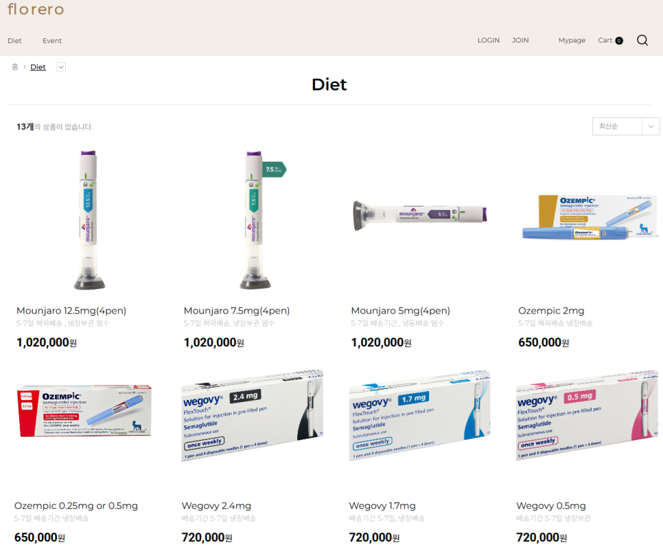 장 의원은 해당 사이트에 접속해보니, 각기 다른 용량의 위고비는 물론 국내에 아직 출시되지 않은 마운자로와 같은 다이어트 의약품도 판매되고 있었다실제 판매자에게 메신저로 구매 가능 여부를 물었더니, 4개월치 이벤트도 진행 중이라며 회원 가입을 유도했다고 설명했다. 또한 처방전 없이도 구매가 가능하냐는 질문에 대리 처방해서 보내드리기 때문에 가능하다는 답변이 돌아왔다.