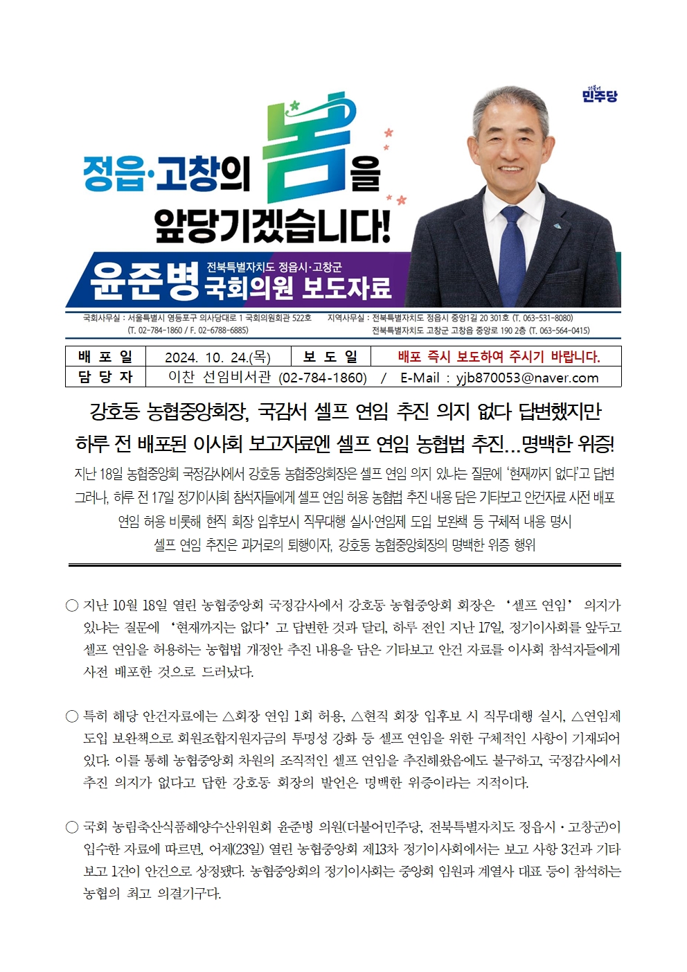 241024 [윤준병 의원 국정감사 보도자료] 강호동 농협중앙회장 셀프 연임 추진 위증 의혹.hwp