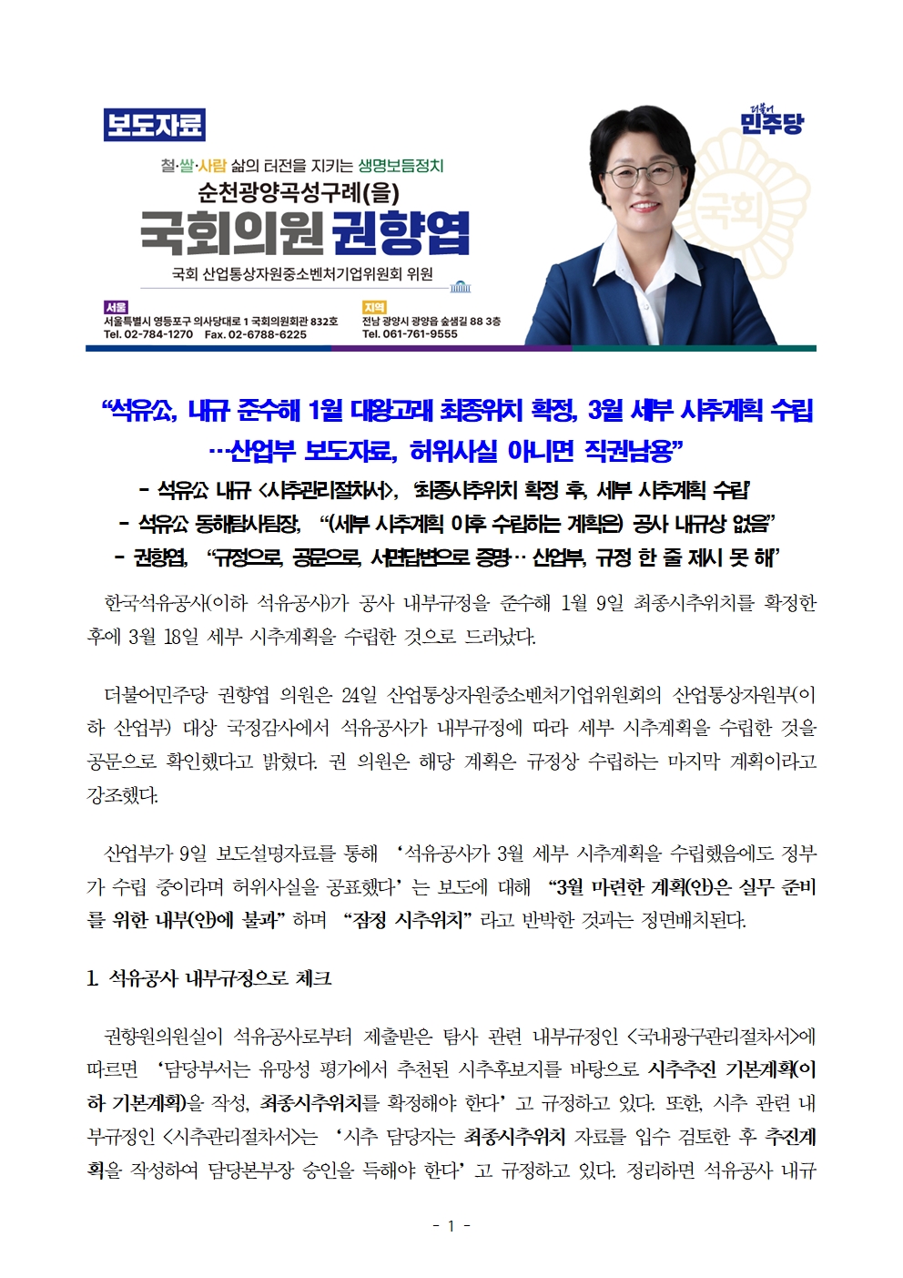 [권향엽 국회의원] 241024 보도자료_석유公 내규 준수해 1월 대왕고래 최종위치 확정 3월 세부 시추계획 수립.hwp