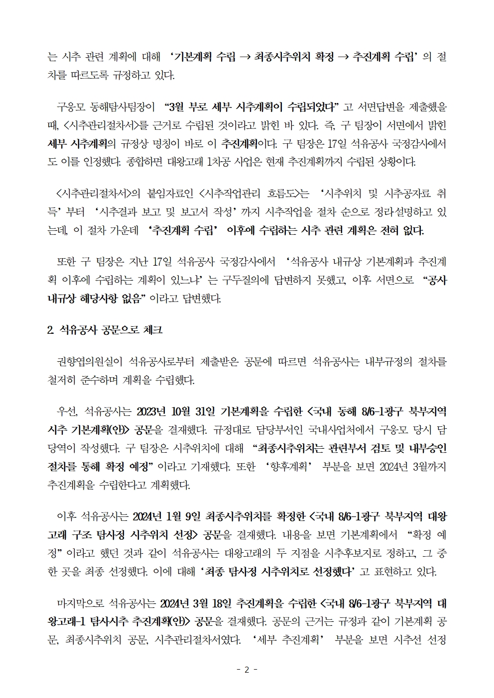 [국회의원 권향엽] "석유公, 내규 준수해 1월 대왕고래 최종위치 확정, 3월 세부 시추계획 수립"