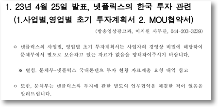 앞서 작년 4월 대통령실과 문화체육관광부는 보도자료를 통해 향후 4년 간 넷플릭스의 25억 달러(33000억원)의 투자 유치를 이끌어 냈다라며, “이는 ‘1호 영업사원, 대통령의 수출 마케팅 성과라고 밝혔다. 또한 대통령실 관계자는 김건희 여사도 이번 투자 유치에 적극적으로 관여했다고 밝힌 바 있다.