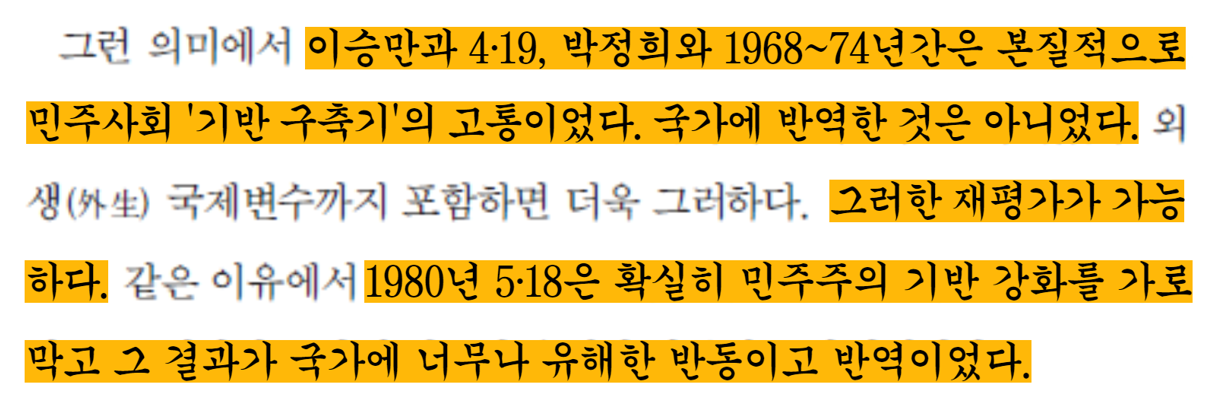 또한, “한국의 독특한 초고속 경제성장의 기반에는 일본이라는 변압기라는 존재가 아주 중요한 역할을 했다”,“이승만과 4.19, 박정희는 본질적으로 민주사회 기반 구축기의 고통이었다. 국가에 반역한 것은 아니다. 그러한 재평가가 가능하다.”등 책에 담겨있는 역사부정내용들을 지적했다.