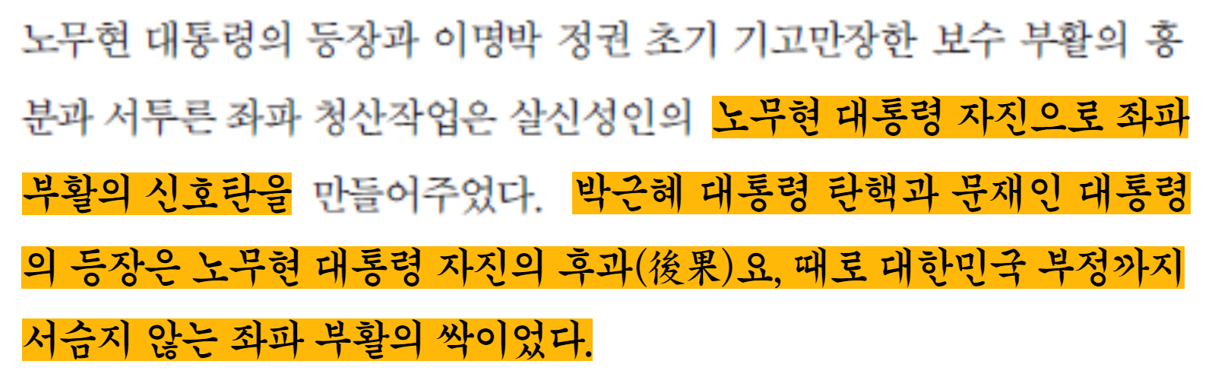 고 노무현 전 대통령의 서거 그 후과’, 즉 좋지 않은 결과로 박근혜 대통령이 탄핵되고 문재인 대통령이 등장했다.’, ‘대한민국 부정까지 서슴지 않는 좌파 부활의 싹이 됐다고 기술된 부분에서 김 의원은 대한민국은 촛불혁명을 통해서 무능하고 부패한 박근혜 정권을 심판하여 문재인 정부를 탄생시킨 자랑스러운 역사를 가진 나라이다라고 쓰여져야 한다고 강력히 주장했다.