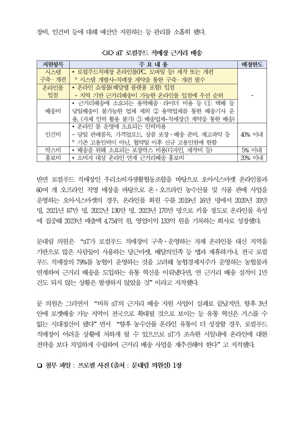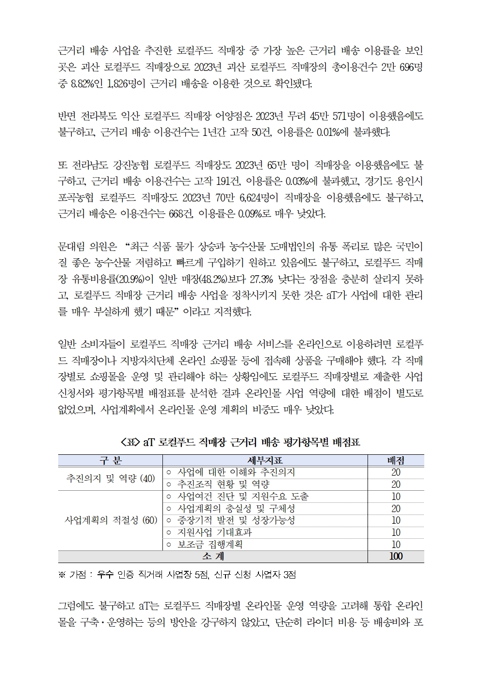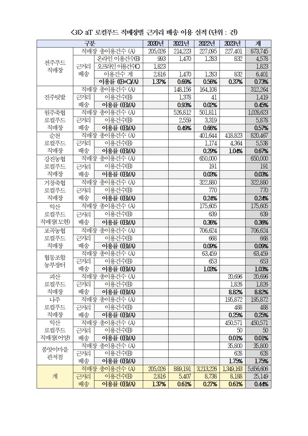 [국회의원 문대림] aT 로컬푸드 직매장 근거리 배송 사업, 로컷배송 꿈꿨지만 0.44% 이용률에 사업 종료