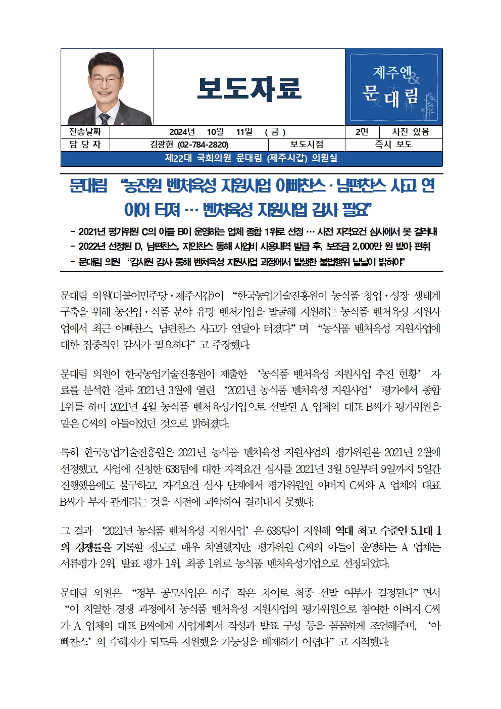 [문대림 의원 보도자료 - 한국농업기술진흥원] 20241011 벤처육성 지원사업 아빠찬스·남편찬스 사고 발생 감사 필요.hwp