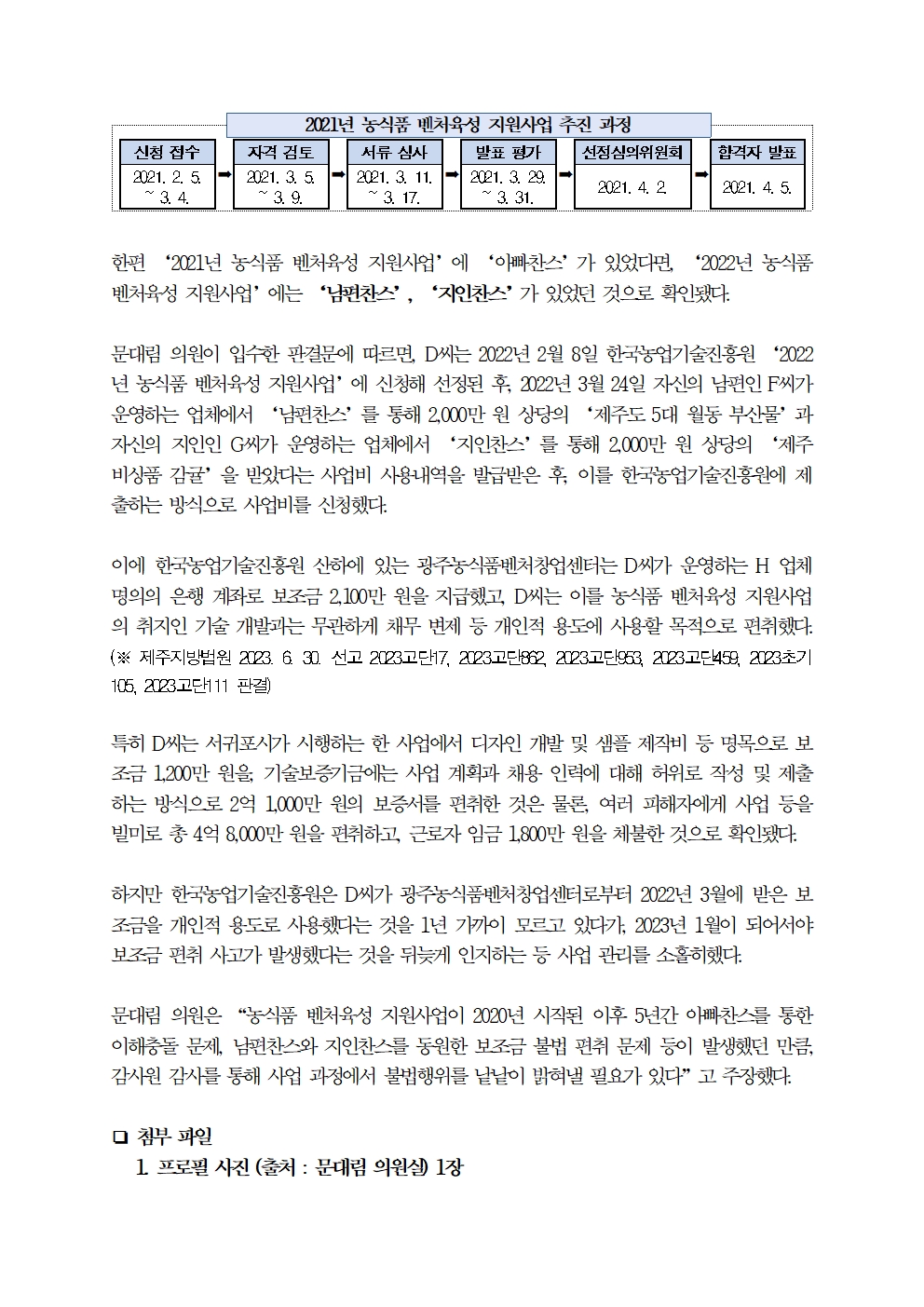 [국회의원 문대림] 농진원 벤처육성 지원사업 아빠찬스·남편찬스 사고 연이어 터져… 벤처육성 지원사업 감사 필요