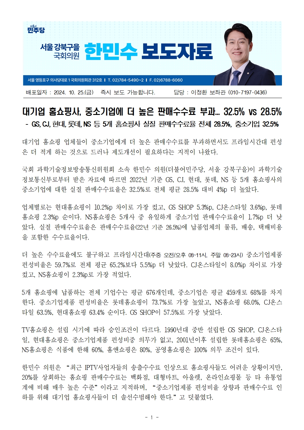 241025_한민수_대기업_홈쇼핑사_중소기업에_더_높은_판매수수료_부과_32_5%_vs_28_5%.hwp