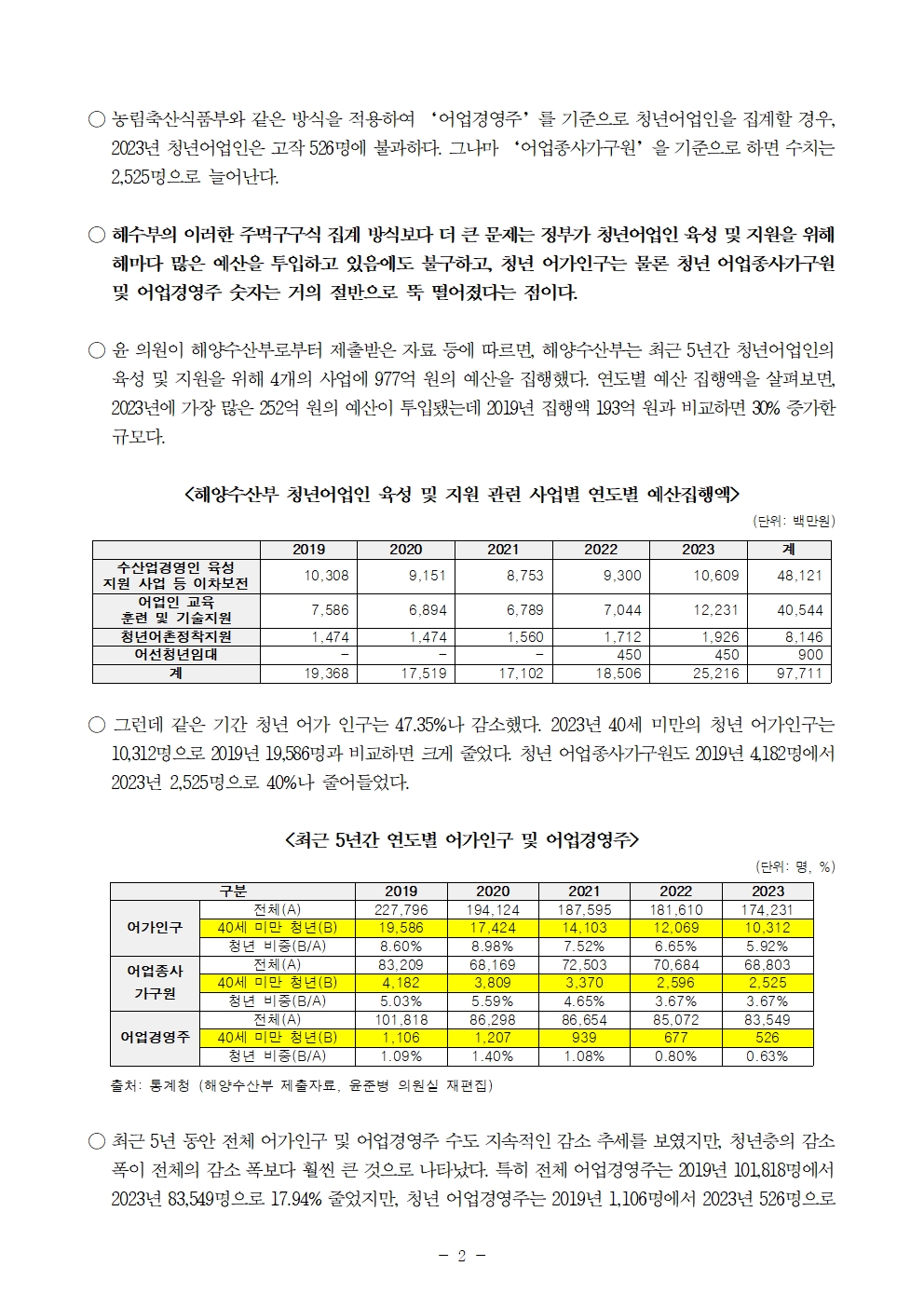 [윤준병 의원 국정감사 보도자료] 어가인구=어업인_ 청년어업인 통계 부풀리는 해양수산부