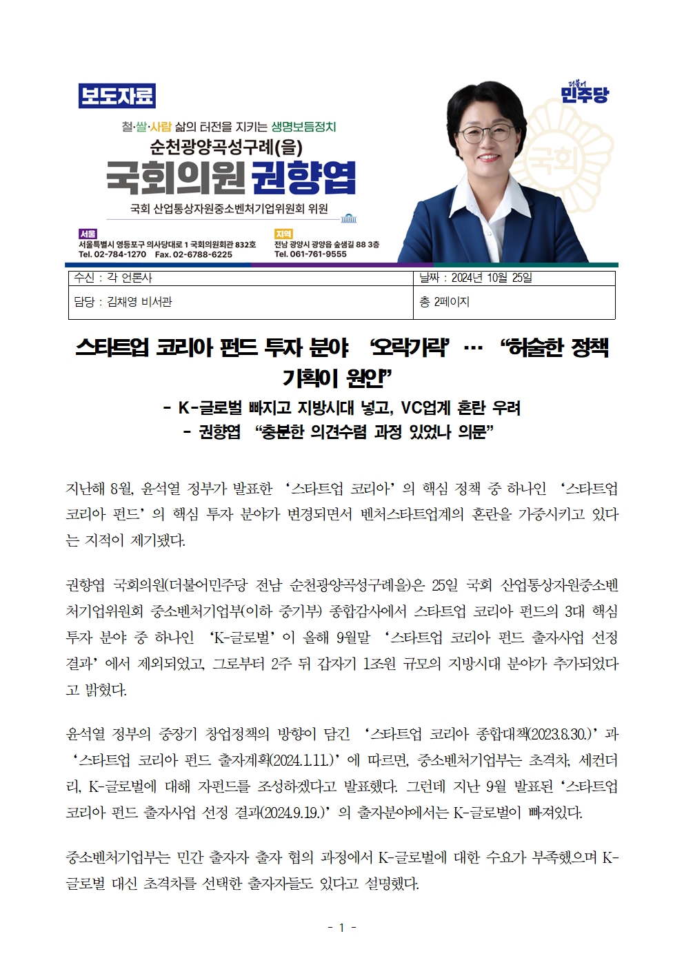 [권향엽 국회의원]_241025_스타트업 코리아 펀드 투자 분야 ‘오락가락’… “허술한 정책 기획이 원인”.hwp
