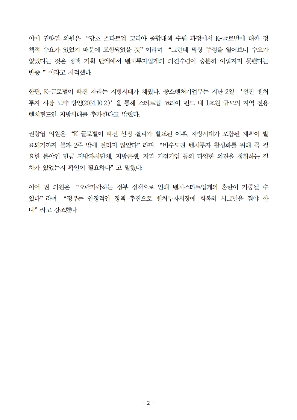 [국회의원 권향엽] 스타트업 코리아 펀드 투자 분야 ‘오락가락’… “허술한 정책 기획이 원인”