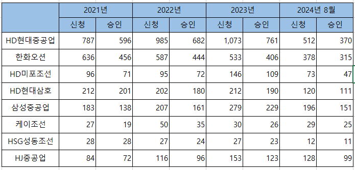2021년부터 20248월까지 8대 조선소(현대중공업, 한화오션, 삼성중공업, 현대미포조선, 삼호중공업, 케이조선, HSG성동조선, HJ중공업)의 산재처리 현황을 보면, 8대 조선소에서 총 8,223건의 산재신청이 이루어져 총 6,271건이 승인 처리됐다.