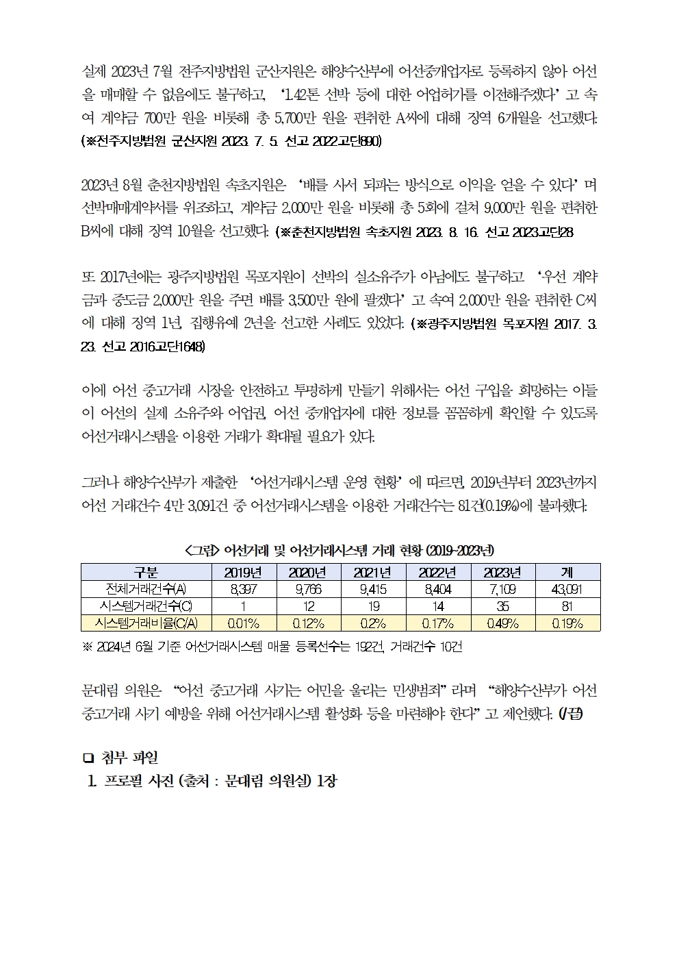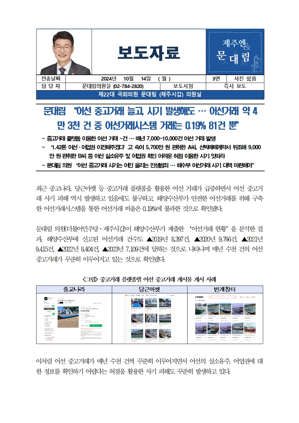 [국회의원 문대림] 어선 중고거래 늘고, 사기 발생해도 … 어선거래 약 4만 3천 건 중 어선거래시스템 거래는 0.19% 81건 뿐