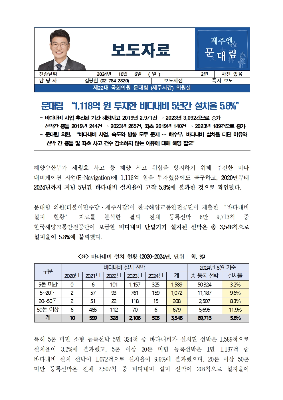 [국회의원 문대림] 1,118억 원 투자한 바다내비 5년간 설치율 5.8%