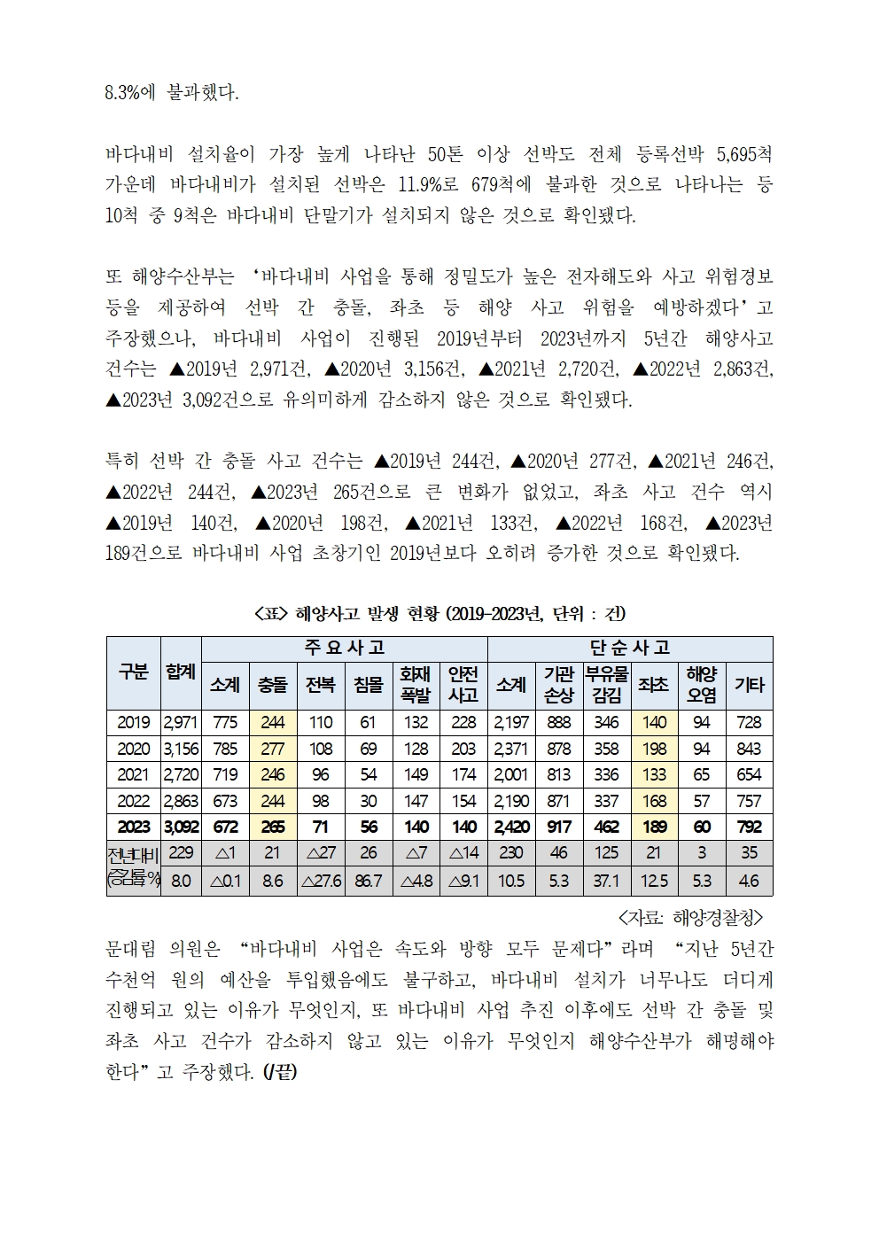 [문대림 의원 보도자료 - 해양수산부] 1118억 원 투자한 바다내비 5년간 설치율 5.8%.hwp