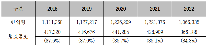 <공공재활용기반시설의 반입량 및 협잡물량 현황>