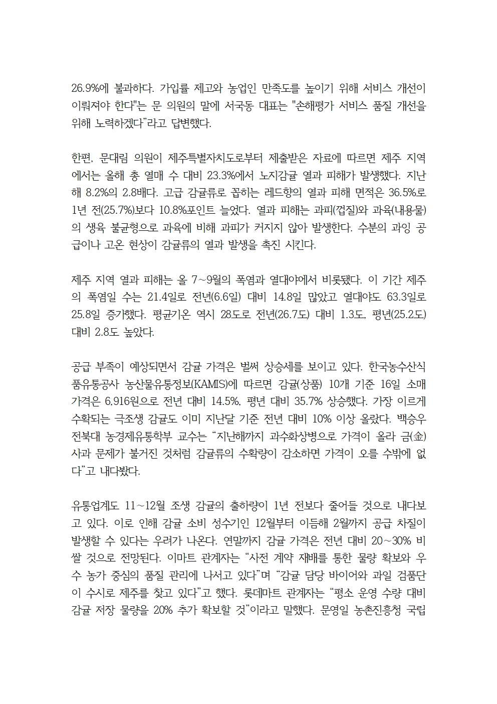 [국회의원 문대림] 농협손보에 레드향 ‘열과’ 농작물재해보험 적용 강력 촉구