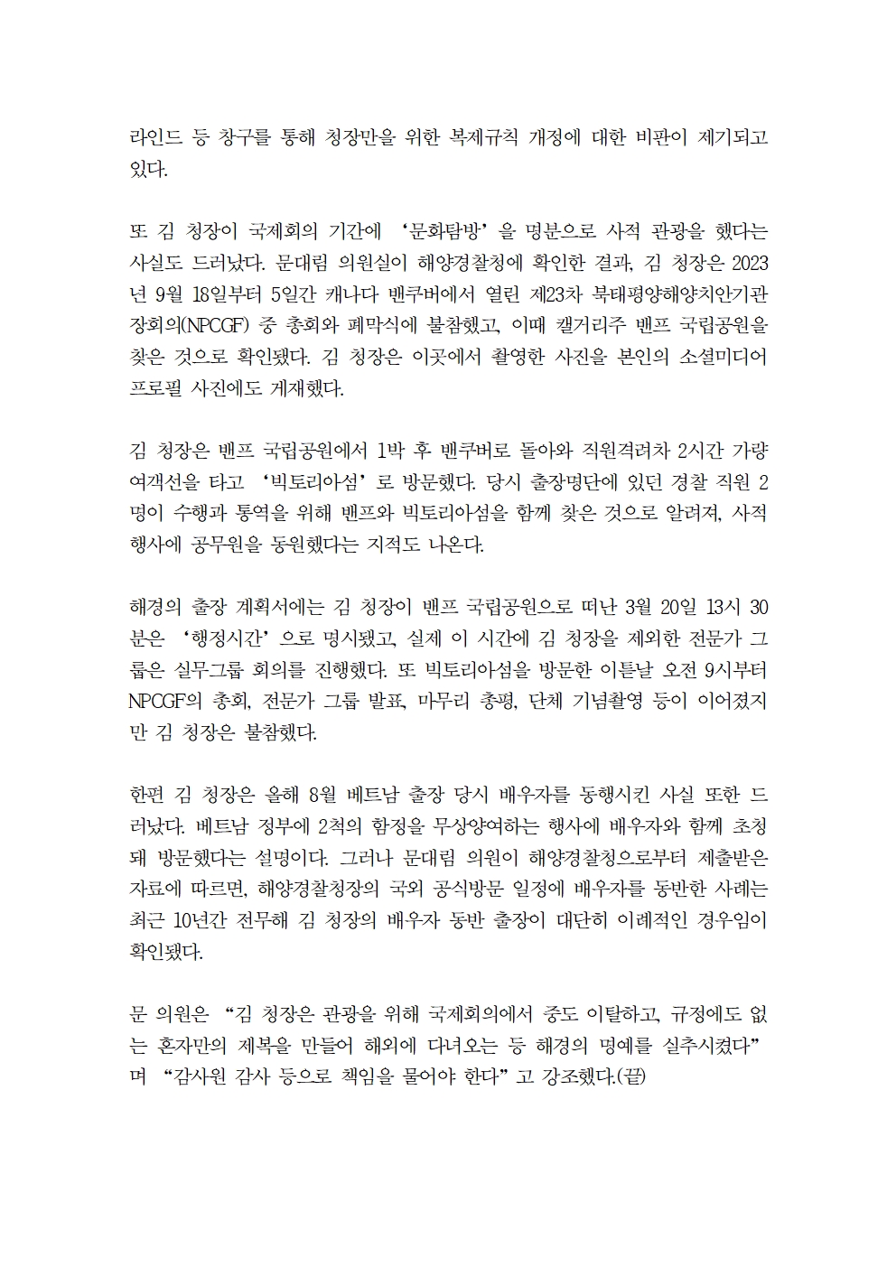 [문대림 의원 보도자료] 해경청장 ‘이상한 출장’... 나만의 제복 입고 1000km거리 인증샷.hwp