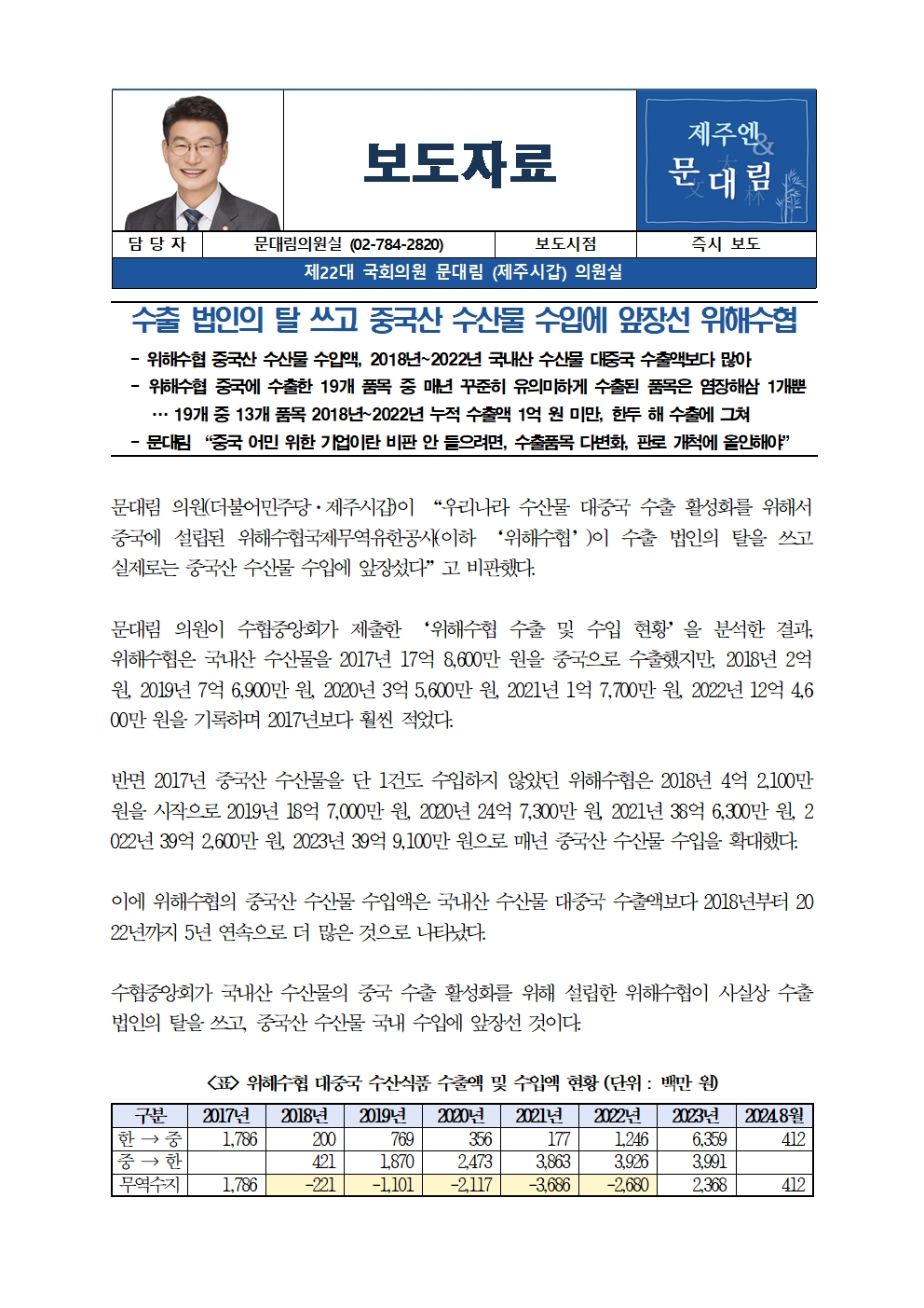 [국회의원 문대림] 수출 법인의 탈 쓰고 중국산 수산물 수입에 앞장선 위해수협