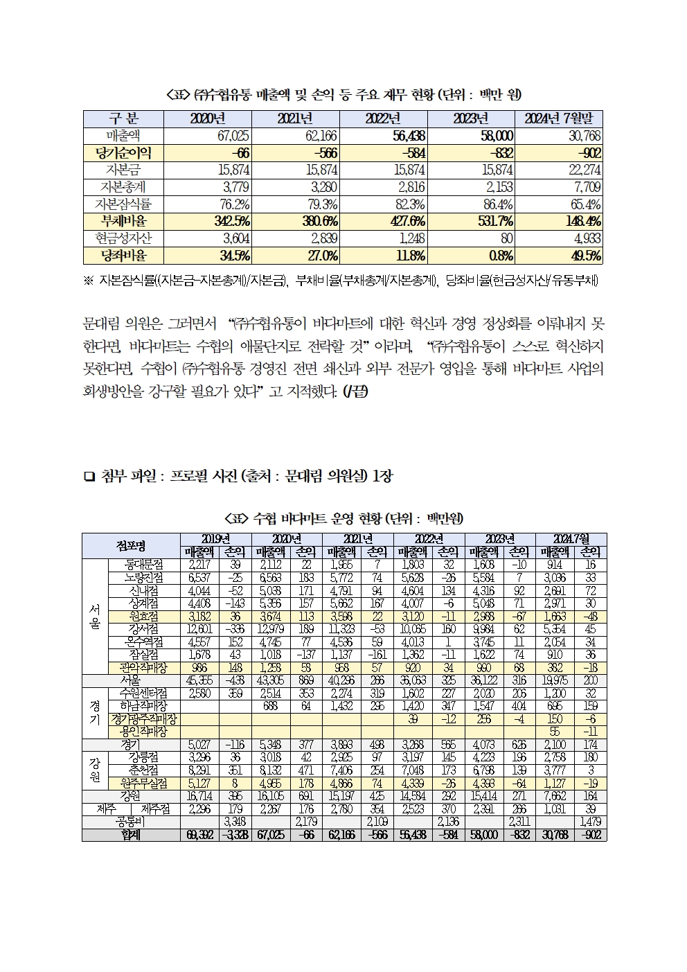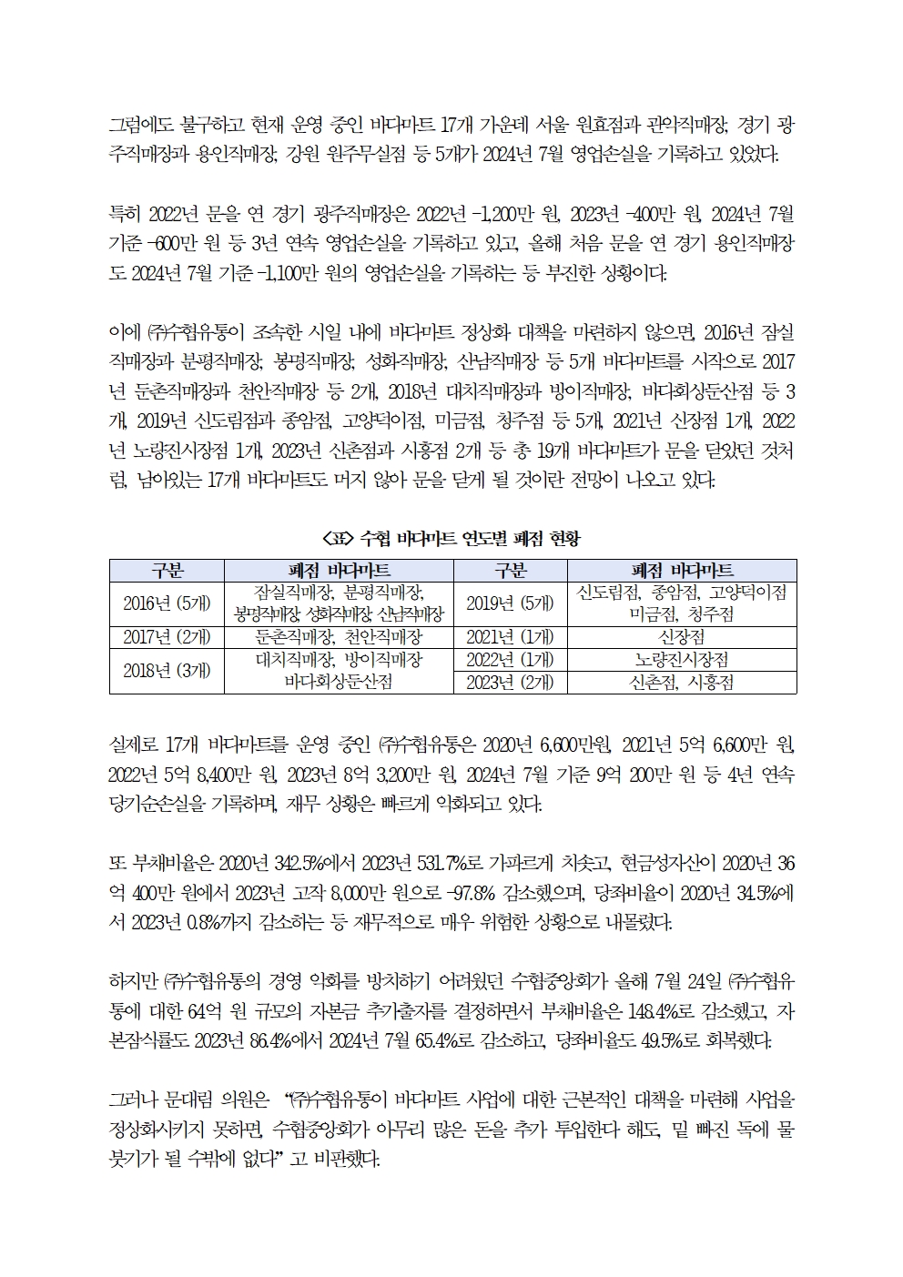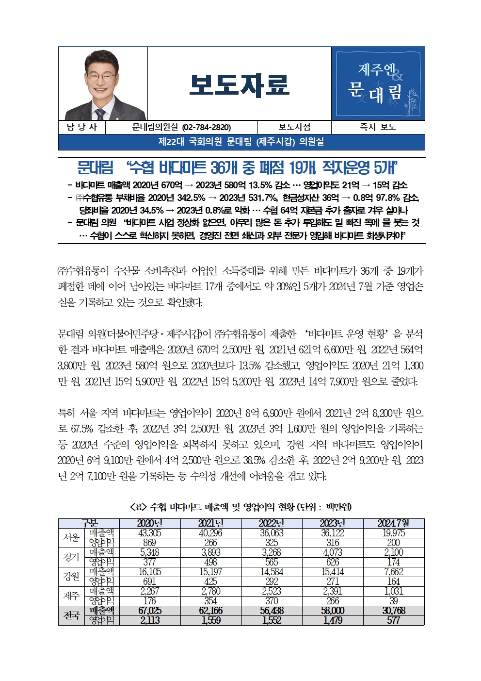 [국회의원 문대림] 수협 바다마트 36개 중 폐점 19개, 적자운영 5개