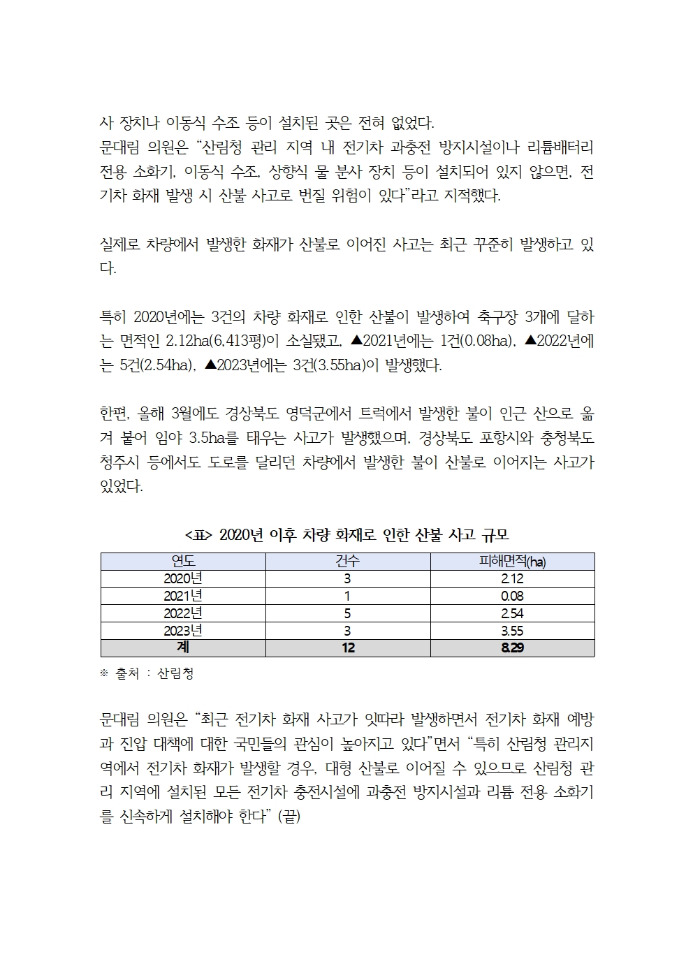 [보도자료]_문대림 의원_대형 산불로 번질 수 있는 산림청 관리 지역도 ‘전기차 화재’ 사각지대.hwp