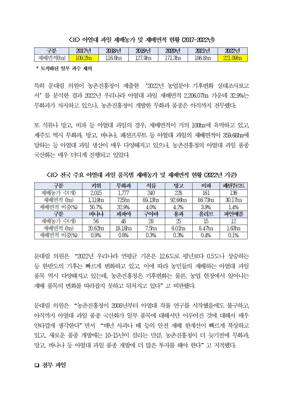[국회의원 문대림] 석류, 망고 등 아열대 과일 재배 2배 이상 늘었는데, 농진청 아열대 과일 신품종 개발 0건