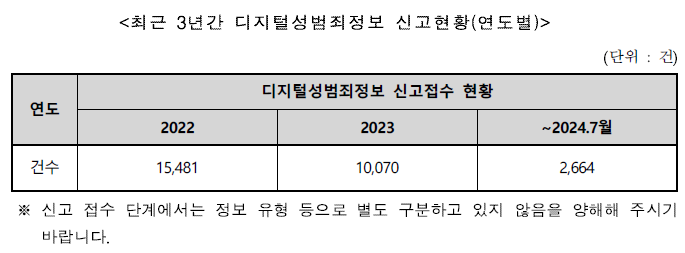 김우영 의원실이 방송통신위원회와 방송통신심의위원회로부터 받은 디지털 성범죄 현황, 대응정책 계획 및 편성 예산 자료에 따르면, 디지털 성범죄정보 신고는 2022년 15,481건, 2023년 10,070건, 2024년 7월까지 2,664건 접수되었다고 한다. 텔레그램 불법 딥페이크 디지털 음란물 유포 사건이 2024년 8월 발견된 만큼 이를 합치면 예년의 통계를 훨씬 웃돌 것으로 보인다.