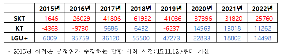 < 통신3사의 연도별 번호이동 순증감 실적 >