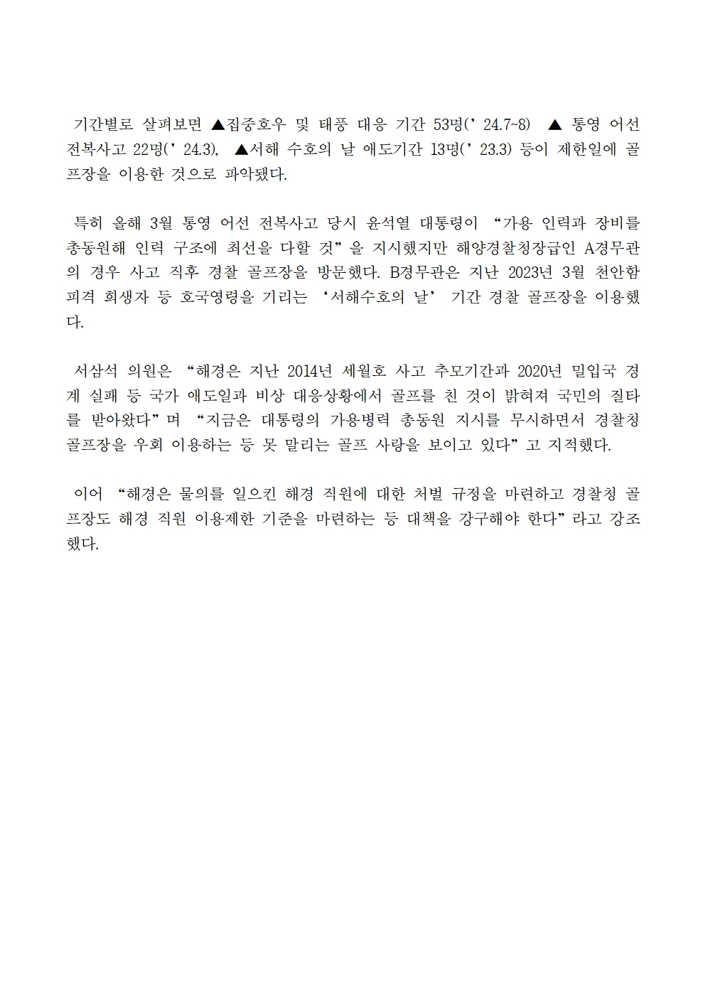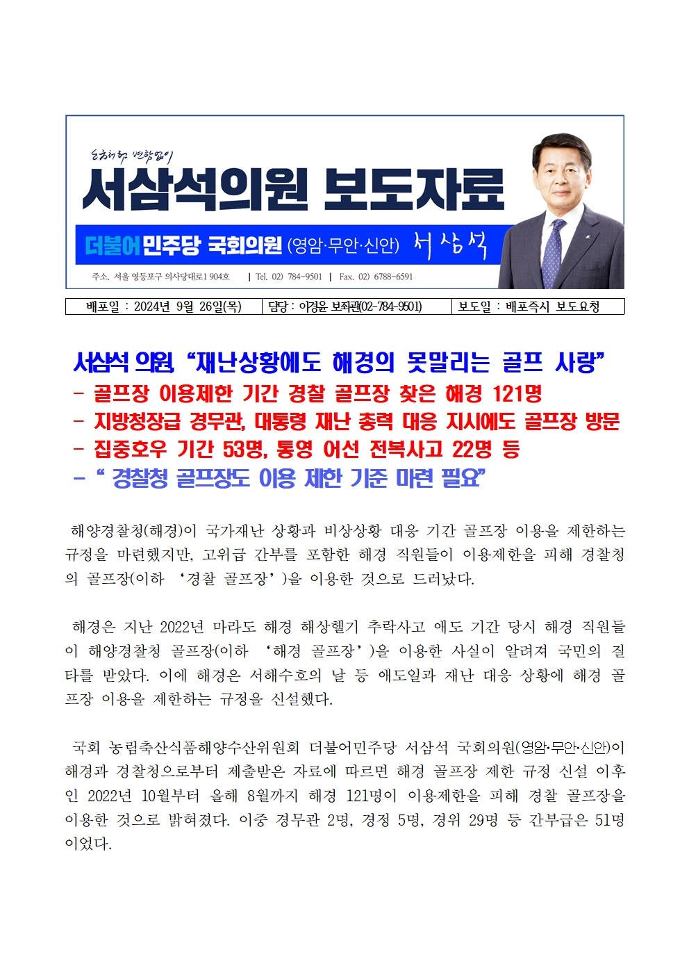 [국회의원 서삼석] 재난상황에도 해경의 못말리는 골프 사랑