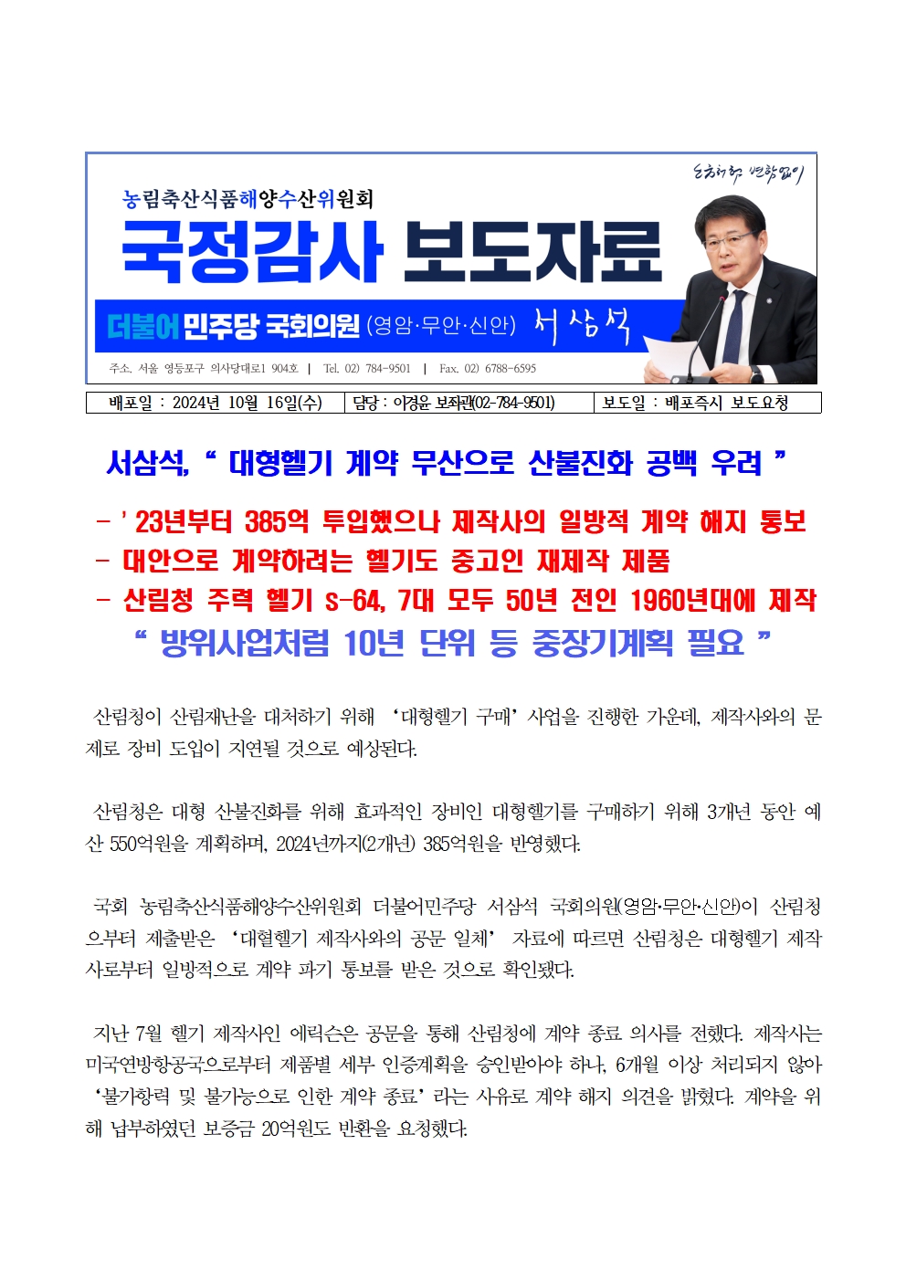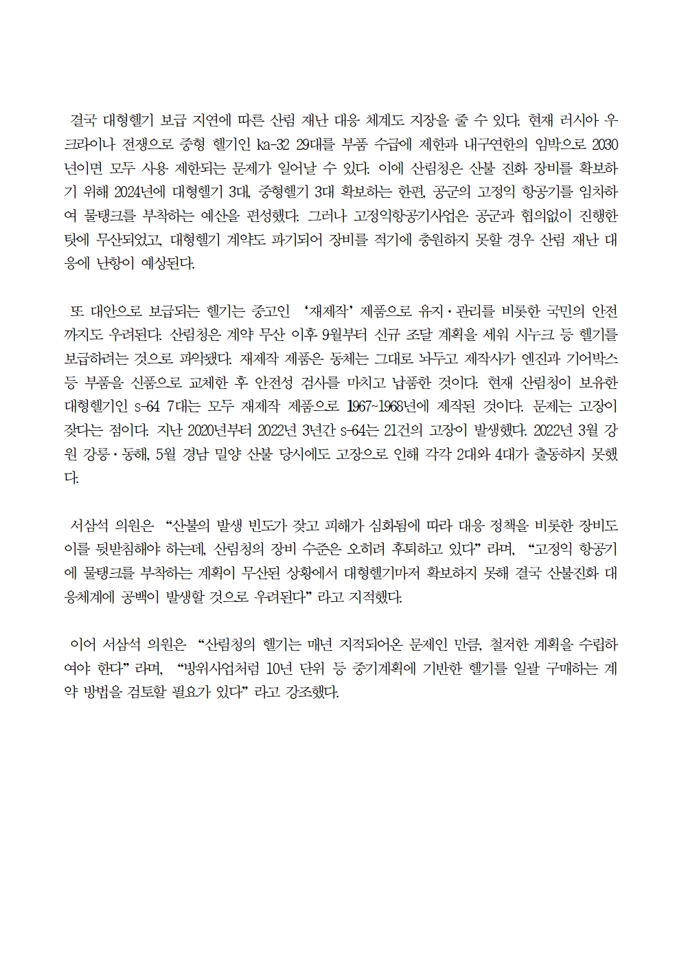 [국회의원 서삼석] 대형헬기 계약 무산으로 산불진화 공백 우려