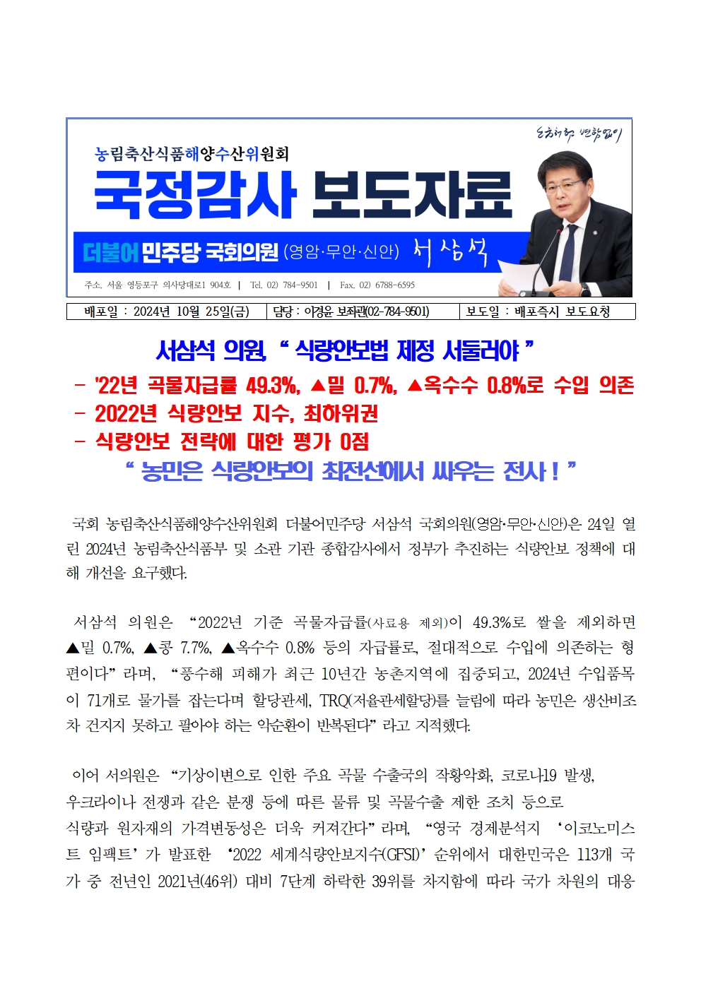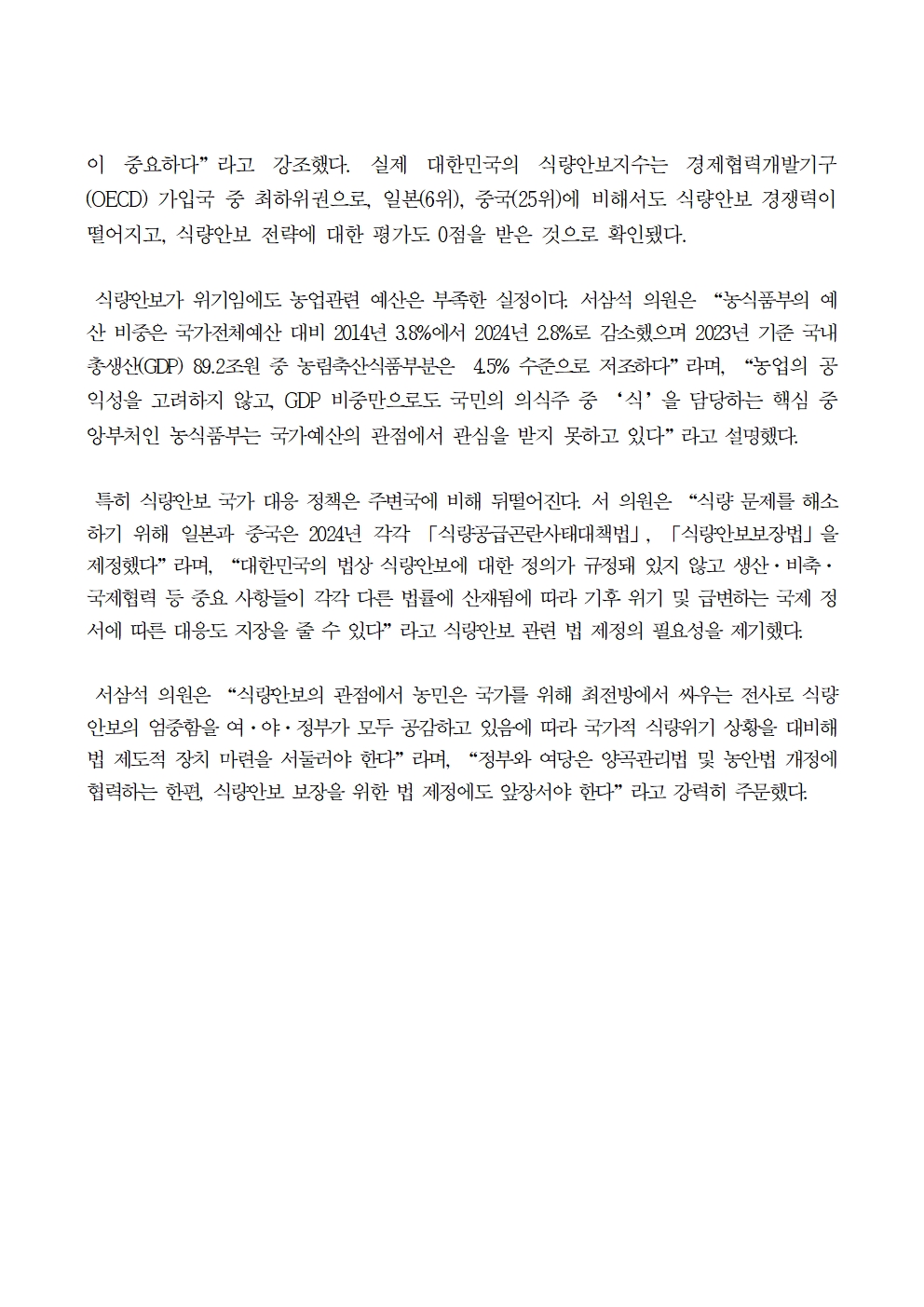 [국회의원 서삼석] 식량안보법 조속히 마련해야