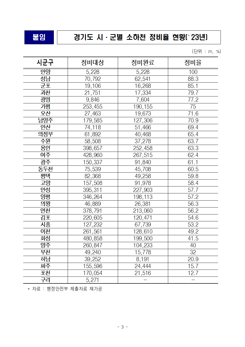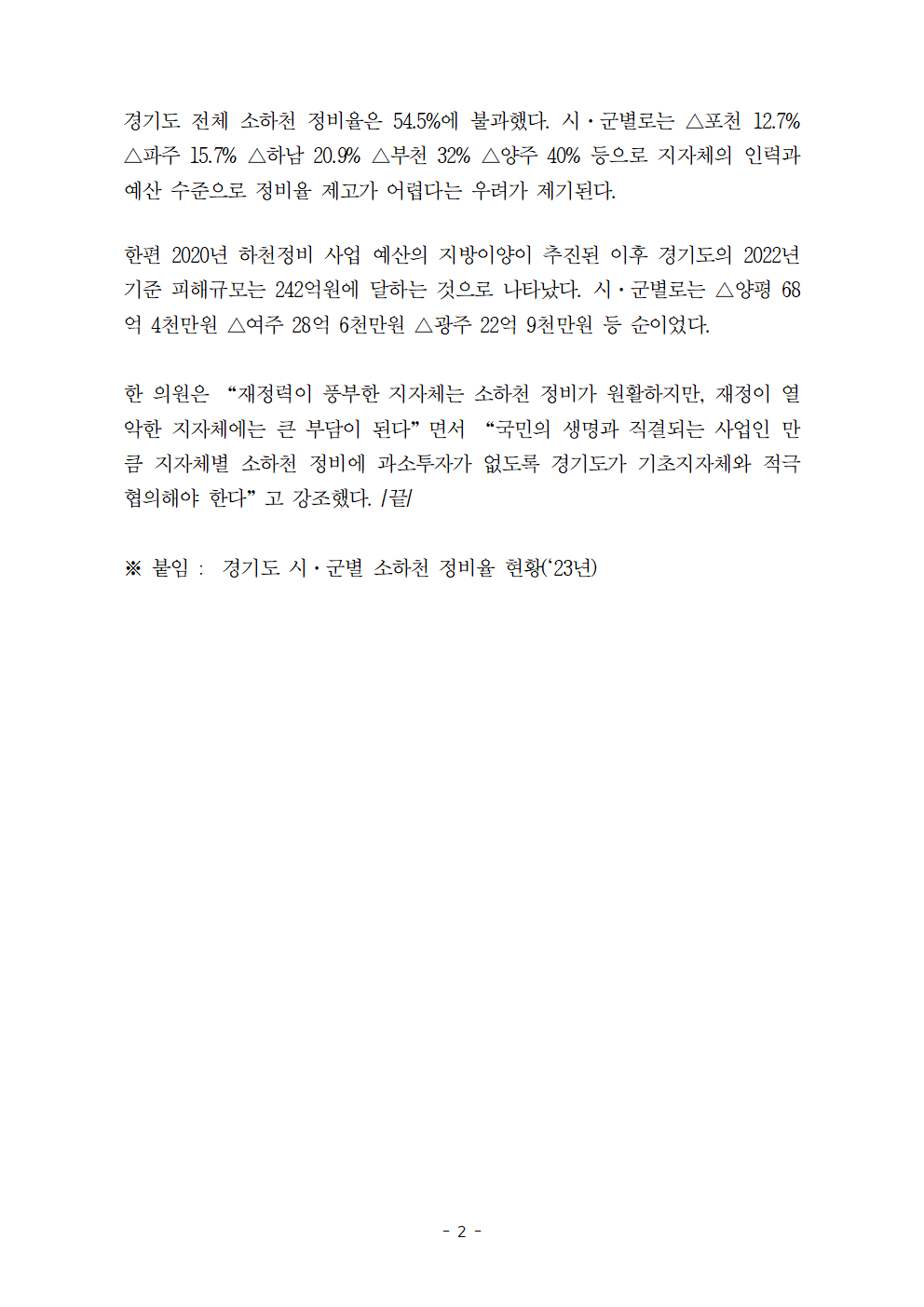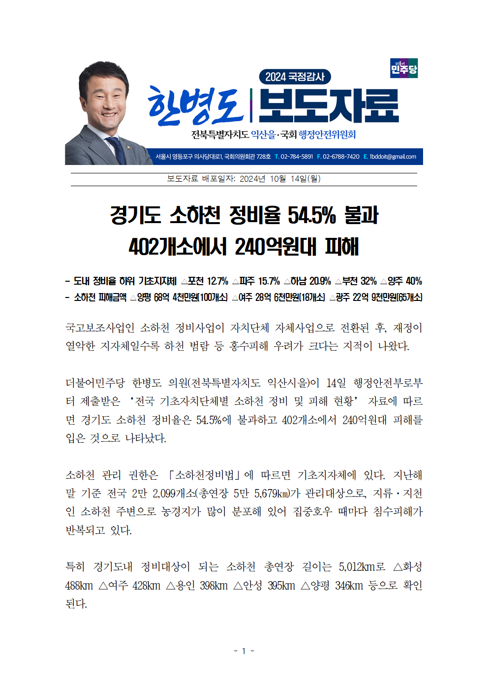 [한병도의원]2024행안위국정감사보도자료(35)경기도 소하천 정비율 54.5퍼센트 불과 402개소에서 240억원대 피해.hwp