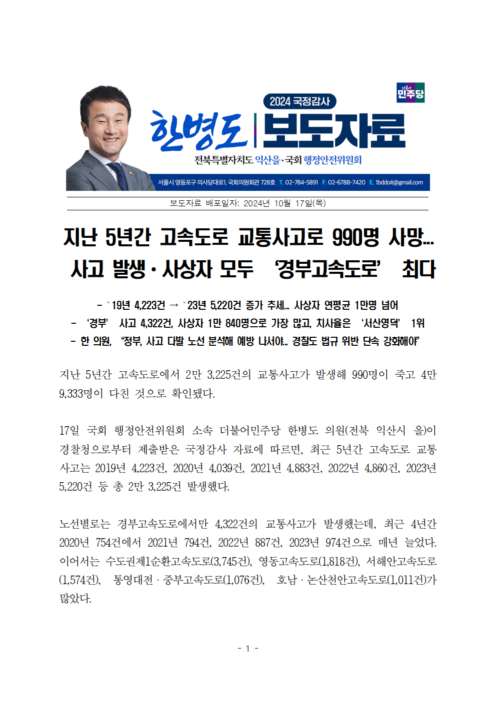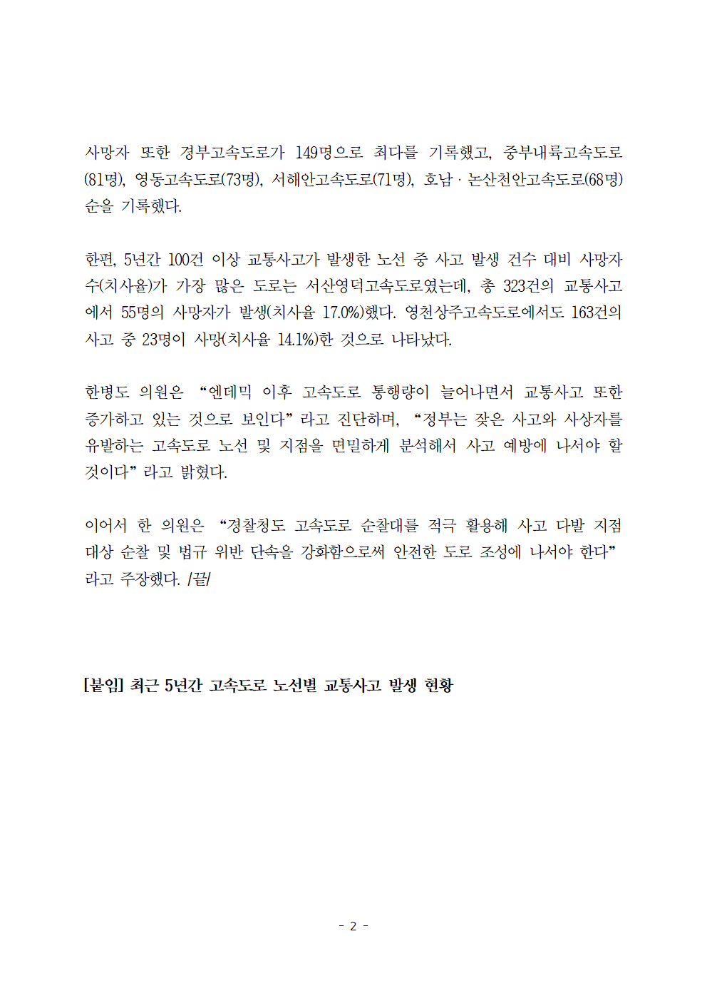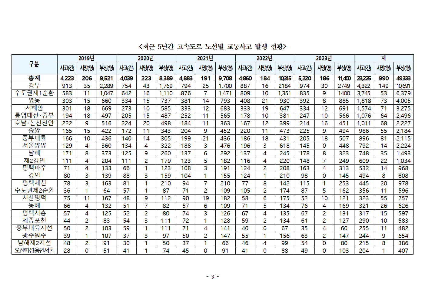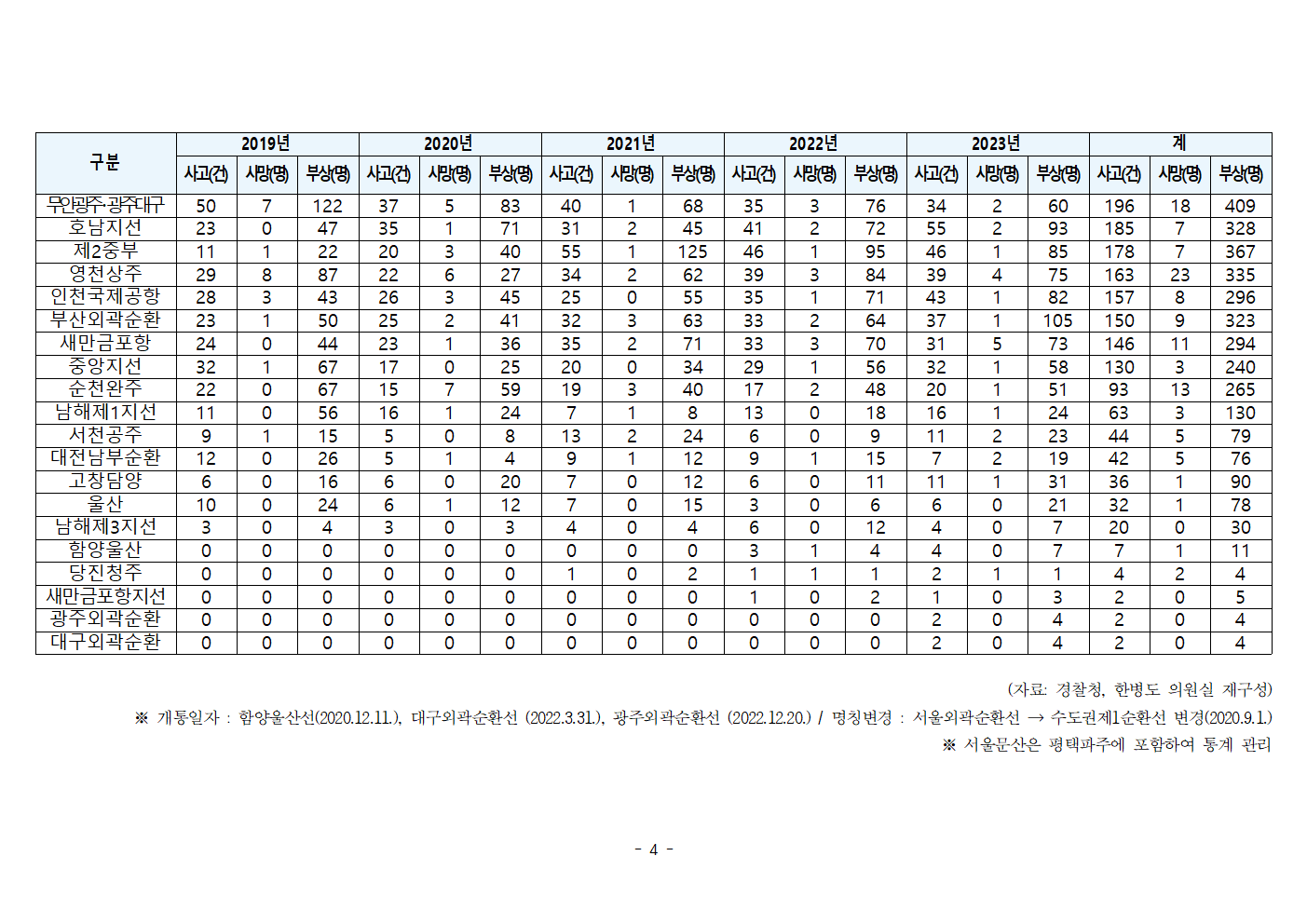 [한병도의원]2024행안위국정감사보도자료(39)지난 5년간 고속도로 교통사고로 990명 사망... 사고 발생ㆍ사상자 ‘경부고속도로’가 최다.hwp