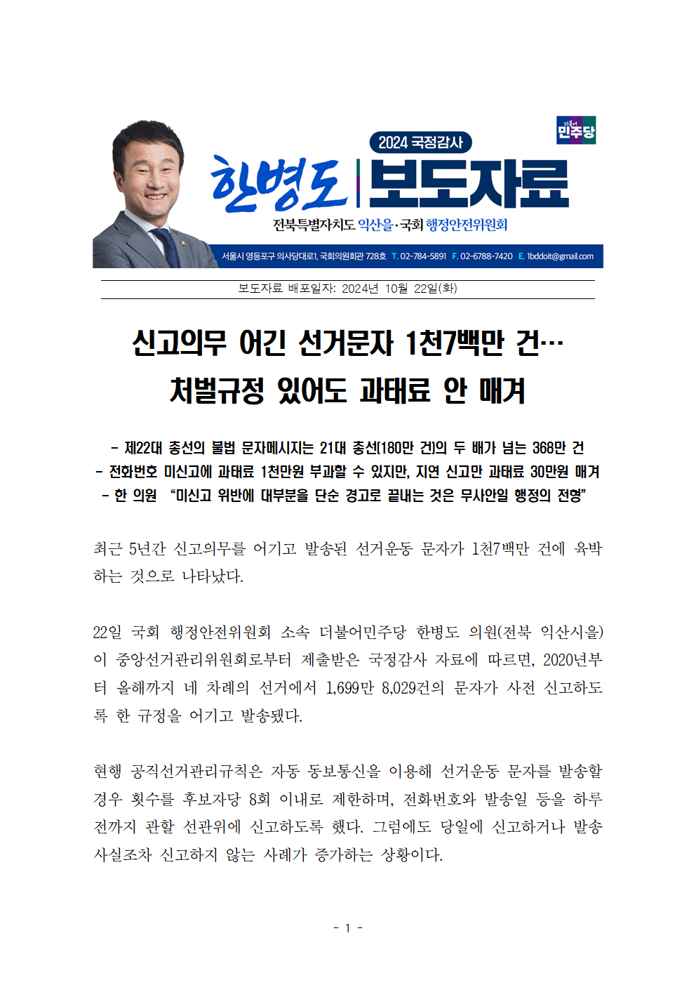 [한병도의원]2024행안위국정감사보도자료(42)신고의무 어긴 선거문자 1천7백만 건 처벌규정 있어도 과태료 안 매겨.hwp