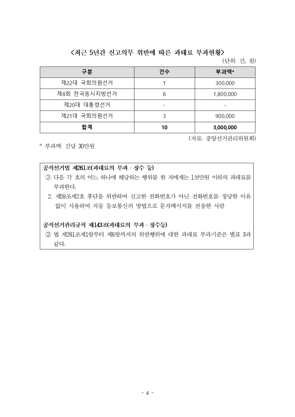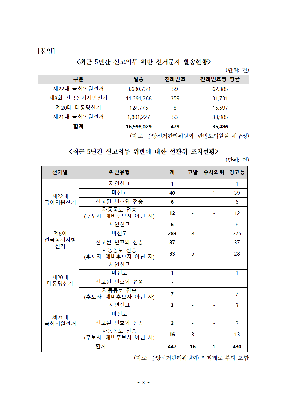 [국회의원 한병도 국정감사] 신고의무 어긴 선거문자 1천7백만 건 처벌규정 있어도 과태료 안 매겨