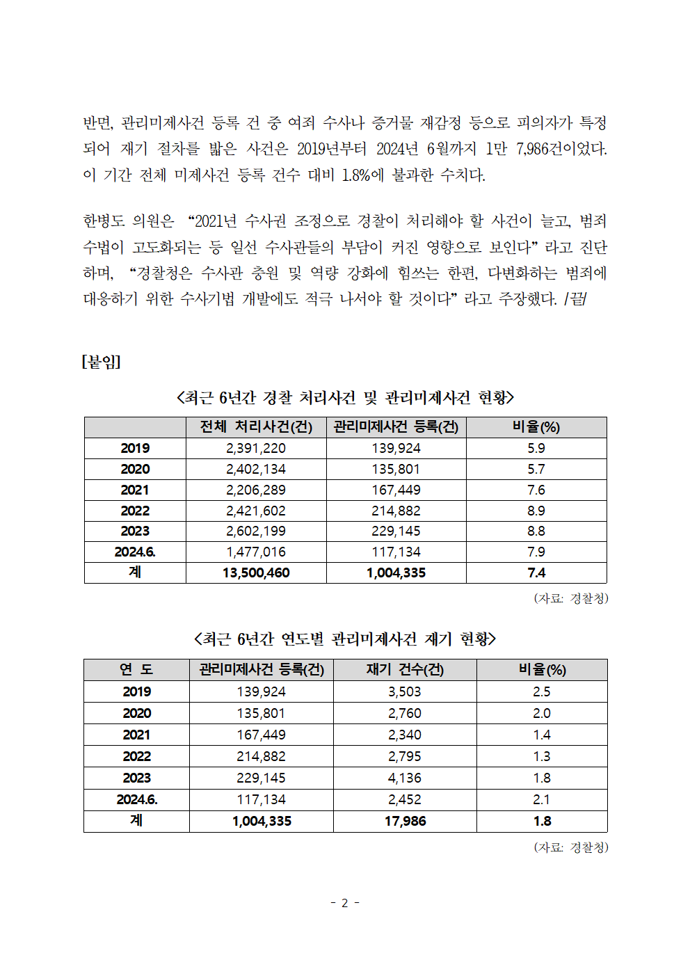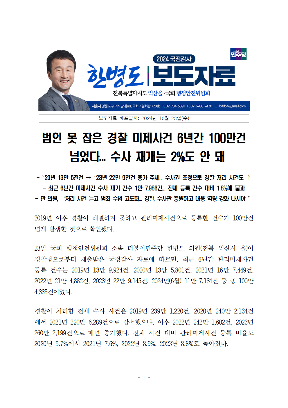 [한병도의원]2024행안위국정감사보도자료(43)범인 못 잡은 경찰 미제사건 6년간 100만건 넘었다....hwp