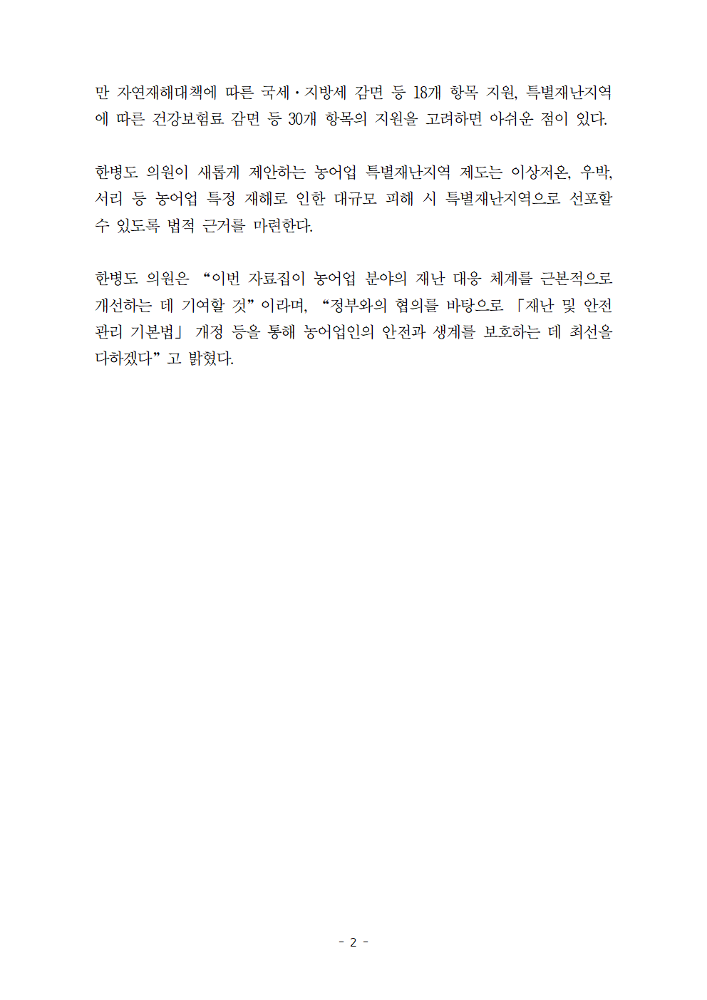 [한병도의원]2024행안위국정감사보도자료(45)한병도 “특별한 재해에 특별한 대응을” 농어업 특별재난지역제도 도입 위한 정책자료집 발간.hwp