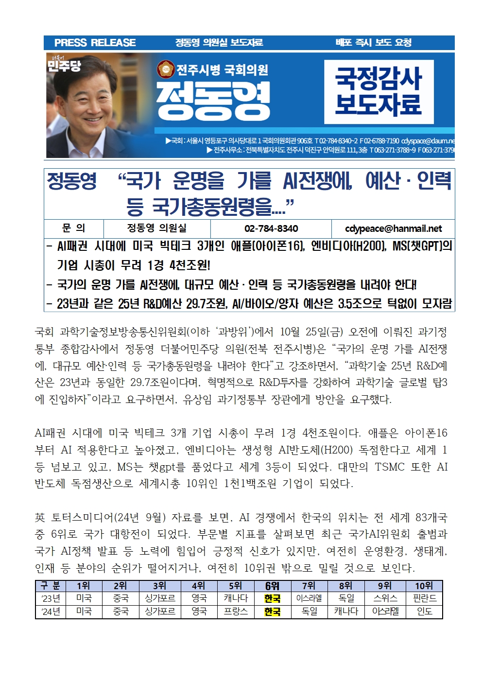 [국회의원 정동영 국감보도자료] 정동영 “국가 운명을 가를 AI전쟁에, 예산·인력 등 국가총동원령을....”