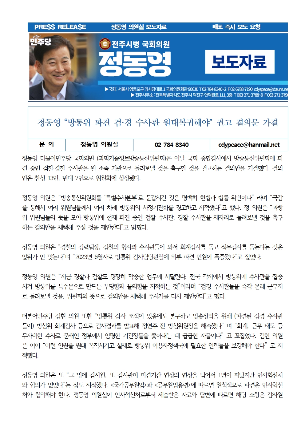 [국회의원 정동영 국감보도자료] 정동영 “방통위 파견 검·경 수사관 원대복귀해야” 권고 결의문 가결