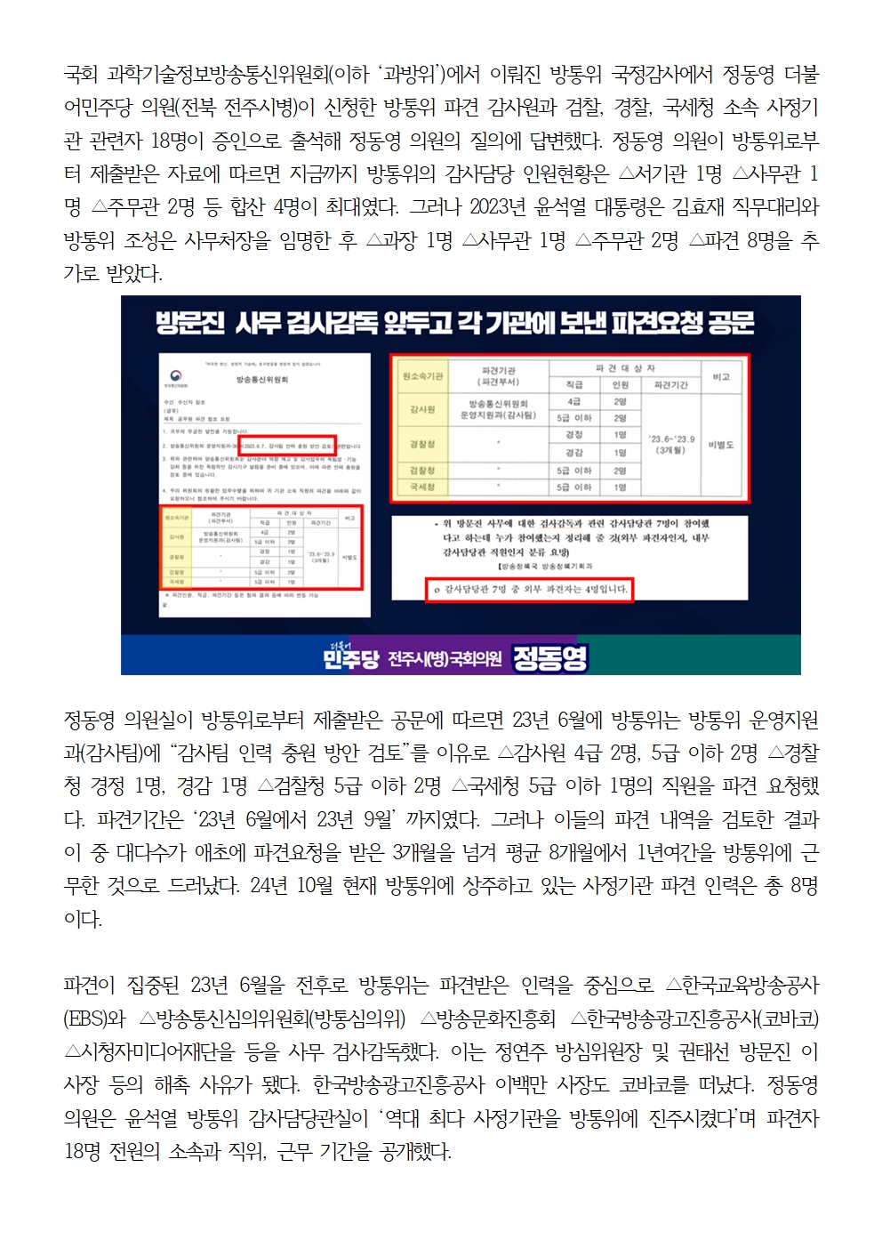 [국회의원 정동영 국감보도자료] 정동영 “윤석열 방통위 법에 근거없는 파견 사정기관원 한 해 동안 18명…불법파견 소지도”