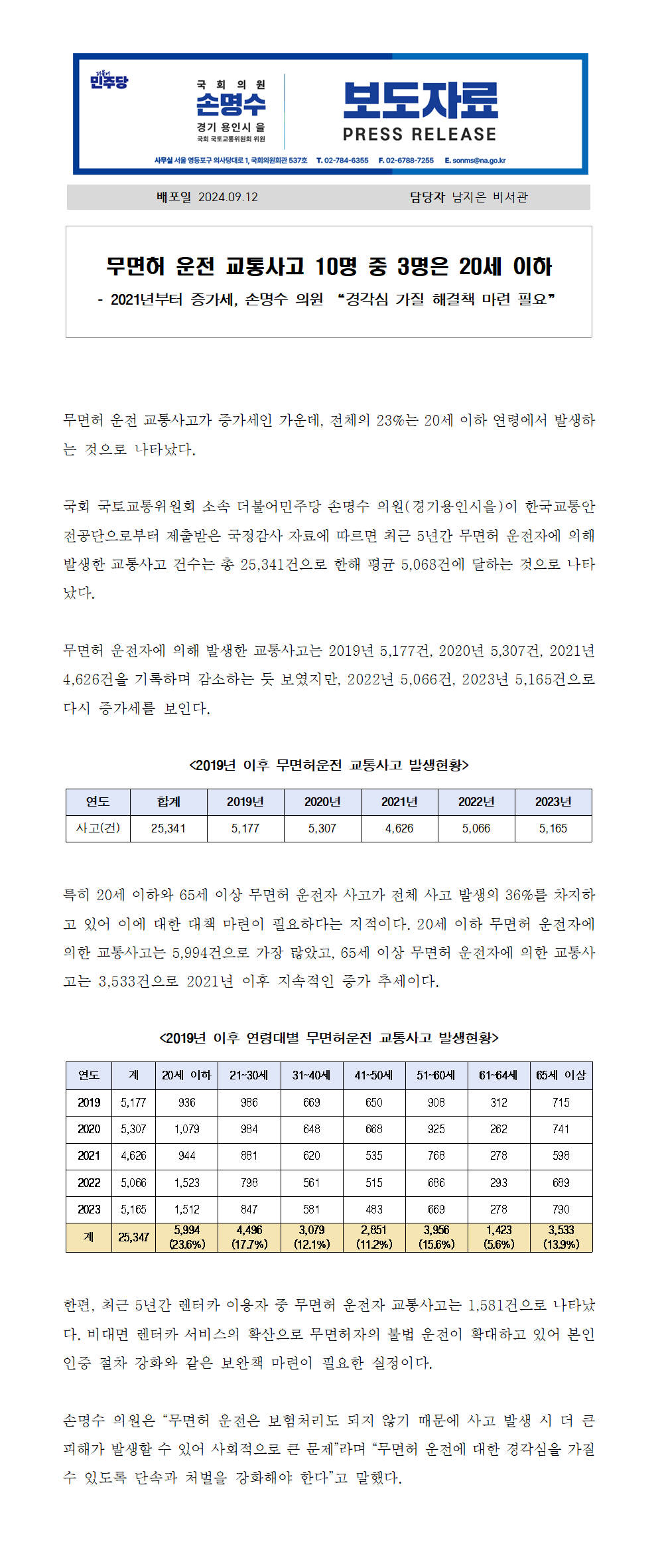 240912_손명수의원실_보도자료_무면허_운전_교통사고_10명_중_3명은_20세_이하.hwp