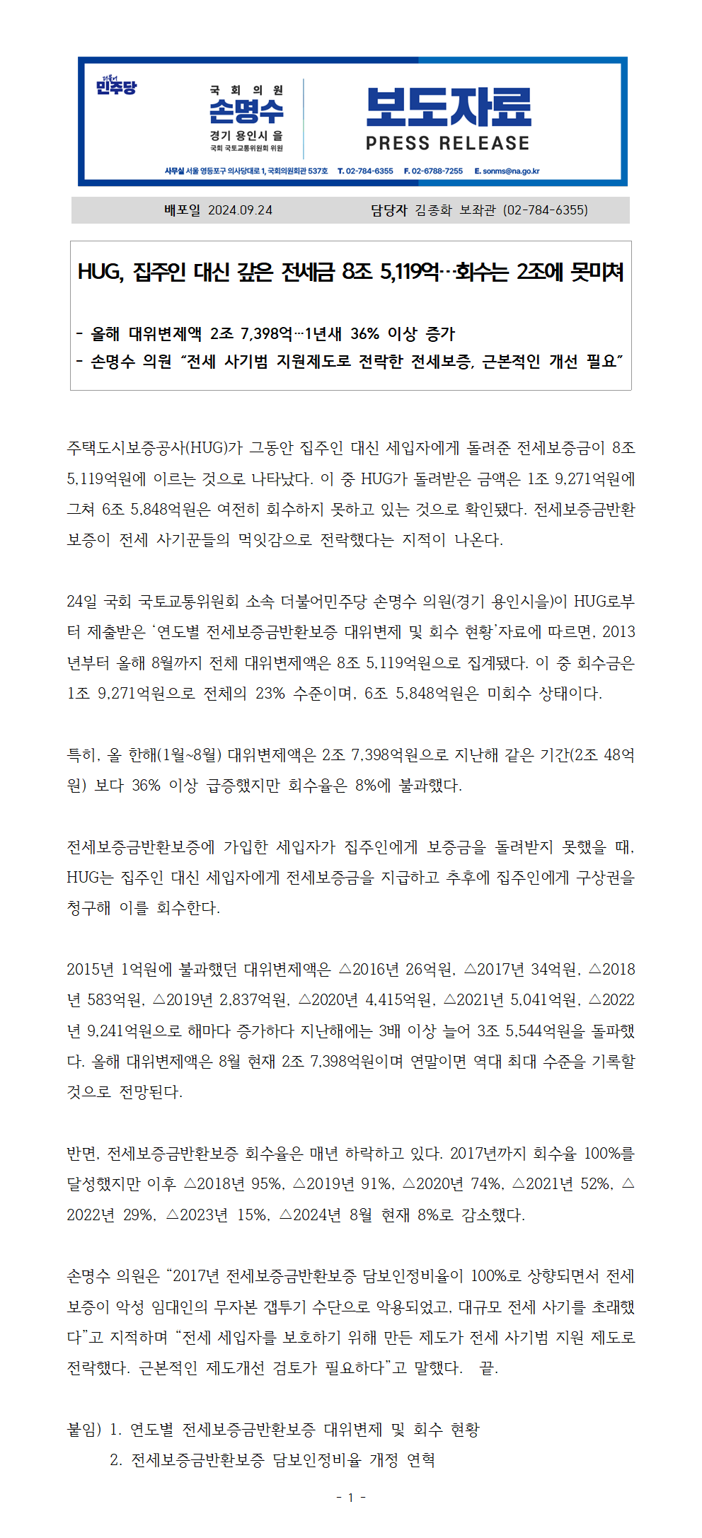 240924_손명수의원실_보도자료_HUG_집주인_대신_갚은_전세금_8조_5119억…회수는_2조에도_못미쳐.hwp