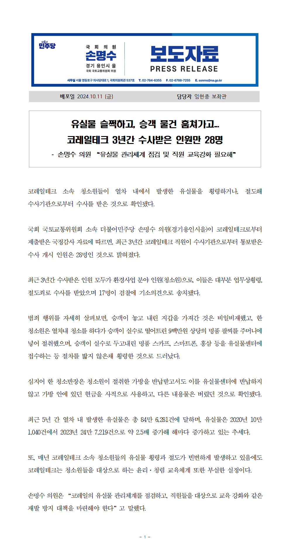 241011_손명수의원실_보도자료_유실물_슬쩍하고_승객_물건_훔쳐가고_코레일테크_3년간_수사받은_인원만_28명.hwp