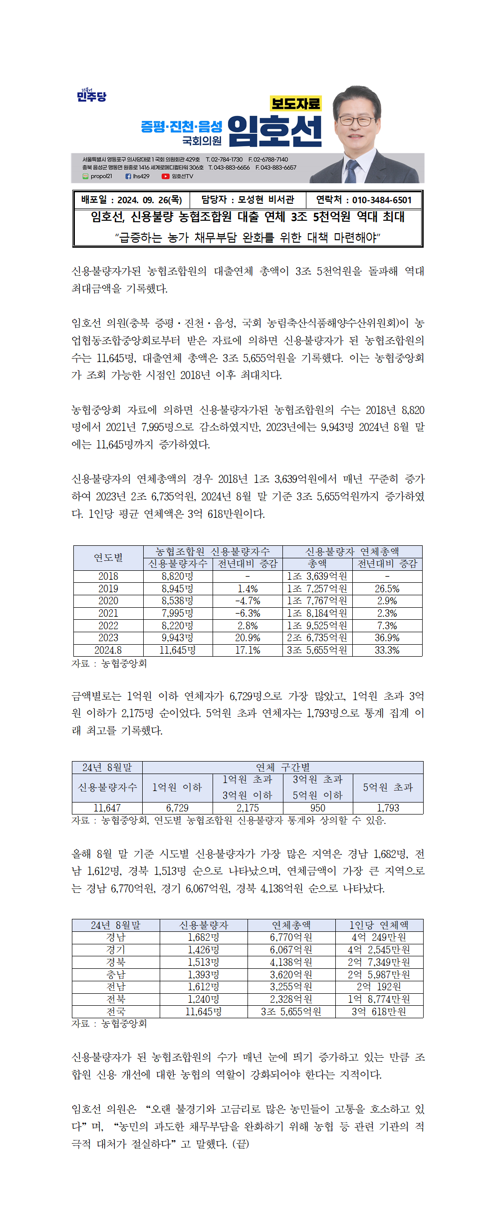 [국회의원 임호선] 신용불량 농협조합원 대출 연체 3조 5천억원 역대 최대