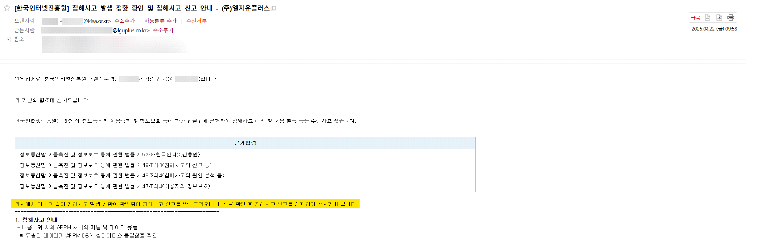 [참고] KISA822KTLGU+데이터 유출이 확인되었으니, 침해신고 하라발송한 공문