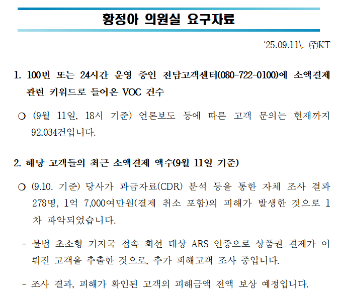 그러나 국회 과학기술정보방송통신위원회 소속 황정아 의원(대전 유성을)KT로부터 제출받은 자료에 따르면, 최근 100번 또는 KT 전담고객센터로 접수된 소액결제 관련 문의는 전날 오후 6시 기준 총 92,034건에 달하는 것으로 나타났다.