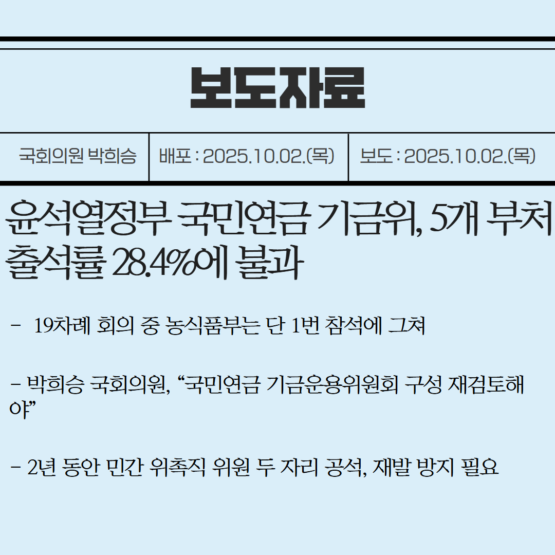 [국회의원 박희승 보도자료] 윤석열정부 국민연금 기금위, 5개 부처 출석률 28.4%에 불과