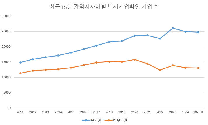 수도권 벤처기업이 2011년 14,836개에서 2025년 24,760개로 66.8%(9,924개) 급증한 반면, 비수도권 벤처기업은 같은 기간 11,312개에서 13,116개로 15.9%(1,804개) 소폭 증가에 그쳤다.