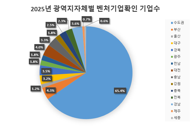 지방의 벤처생태계의 취약성은 더욱 심각하다. 2025년 현재 지역 벤처기업 분포 비율을 보면 세종 0.6%, 제주 0.7%로 가장 열악했고, 이어 울산 1.2%, 광주·전남·강원이 각각 1.8%, 전북 2.3%, 충북 2.5% 등으로 대부분 지역이 2% 내외에 머물렀다.