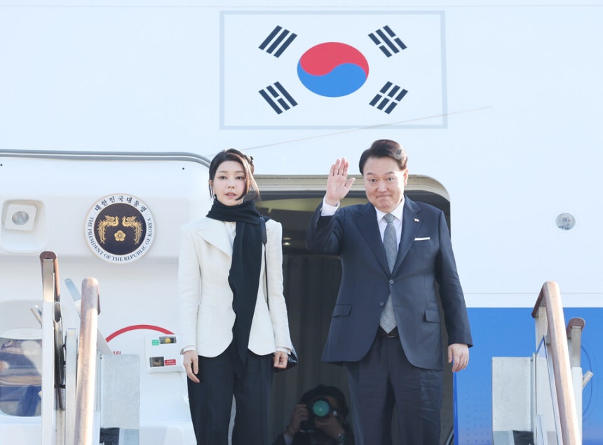 영국을 국빈 방문하는 윤석열 전 대통령과 부인 김건희 여사가 2023년 11월 경기 성남 서울공항에서 전용기인 공군 1호기에 올라 출국 인사를 하고 있다. ⓒ 연합뉴스