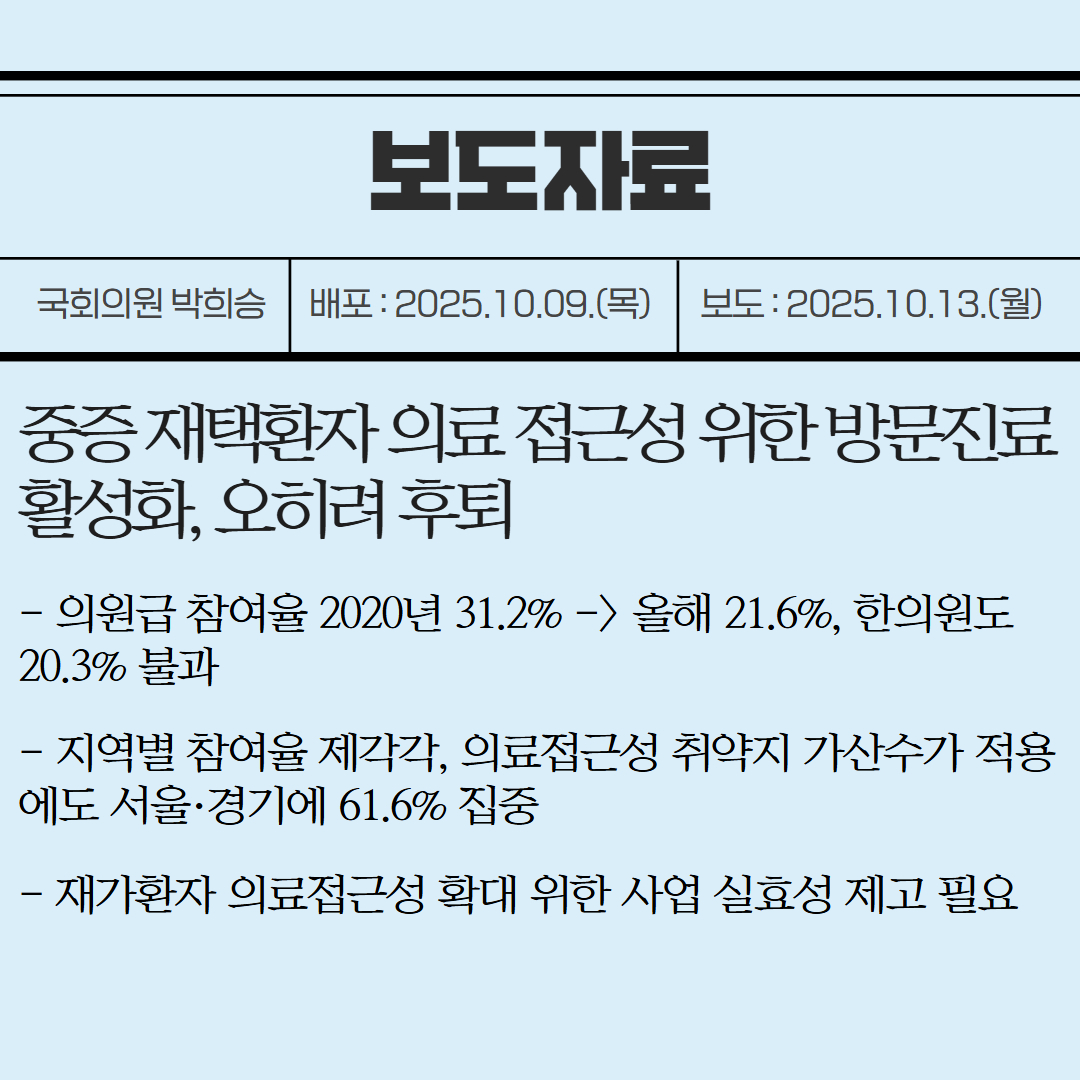 [국회의원 박희승 보도자료] 중증 재택환자 의료 접근성 위한 방문진료 활성화, 오히려 후퇴